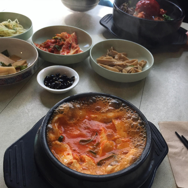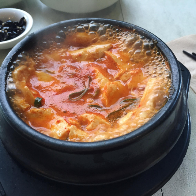 얼핏 보면 순두부찌개와도 비슷한 모습이지만, 순두부찌개보다 좀 더 자작하게 끓여내어 걸쭉하고 짭짤한 국물에 (아.. 표현력의 한계) 순두부보단 조직감이 있는 두부의 질감이 마음에 들었음. 누구나 상상할 수 있는 맛이지만, 그게 참 맛있었다ㅎㅎ