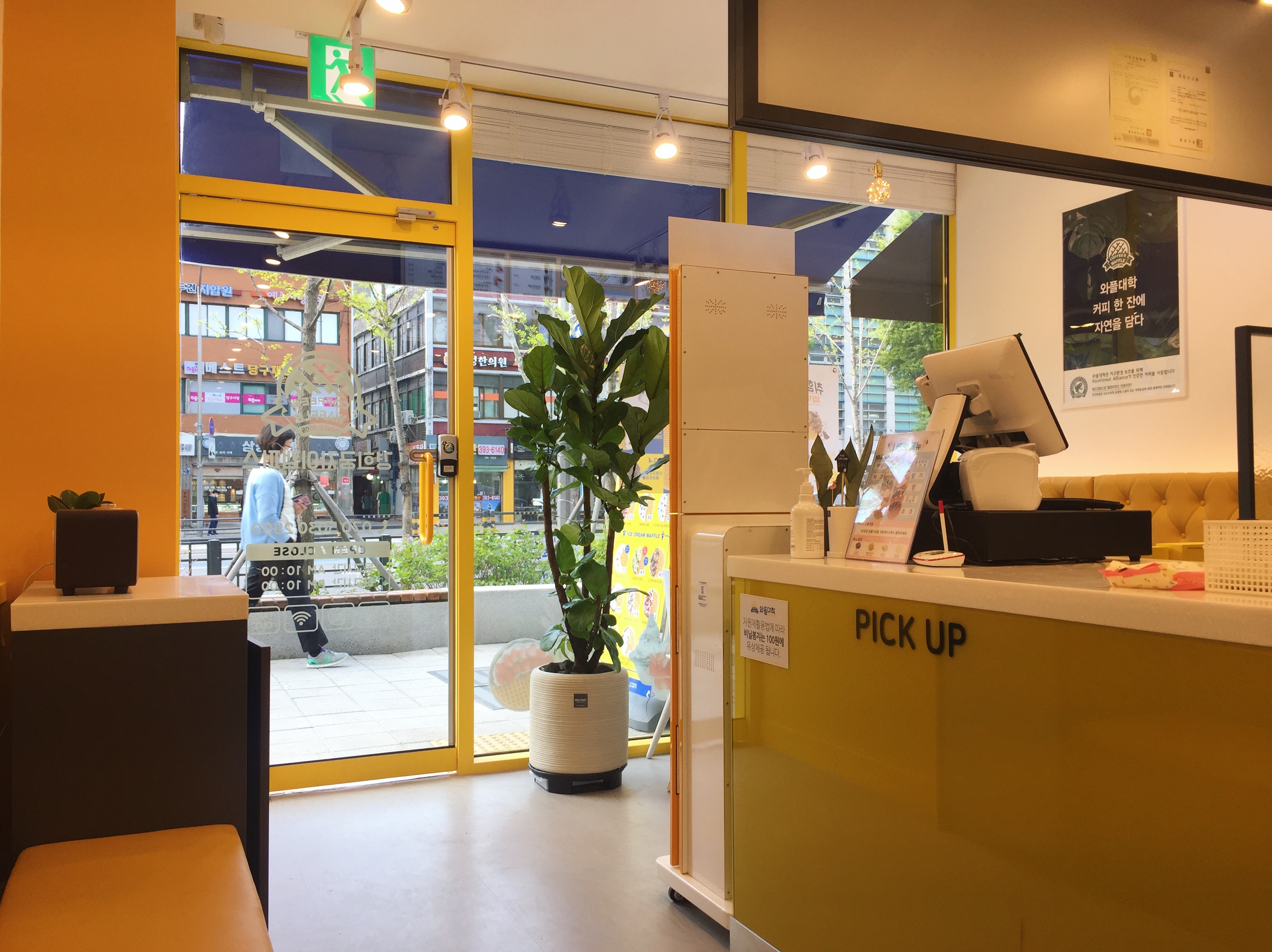 식사를 해야하는데 입맛이 없어 무작정 길거리를 걷다가 와플대학이 보여 들어옴. 노랑노랑한 매장이 산뜻하다.