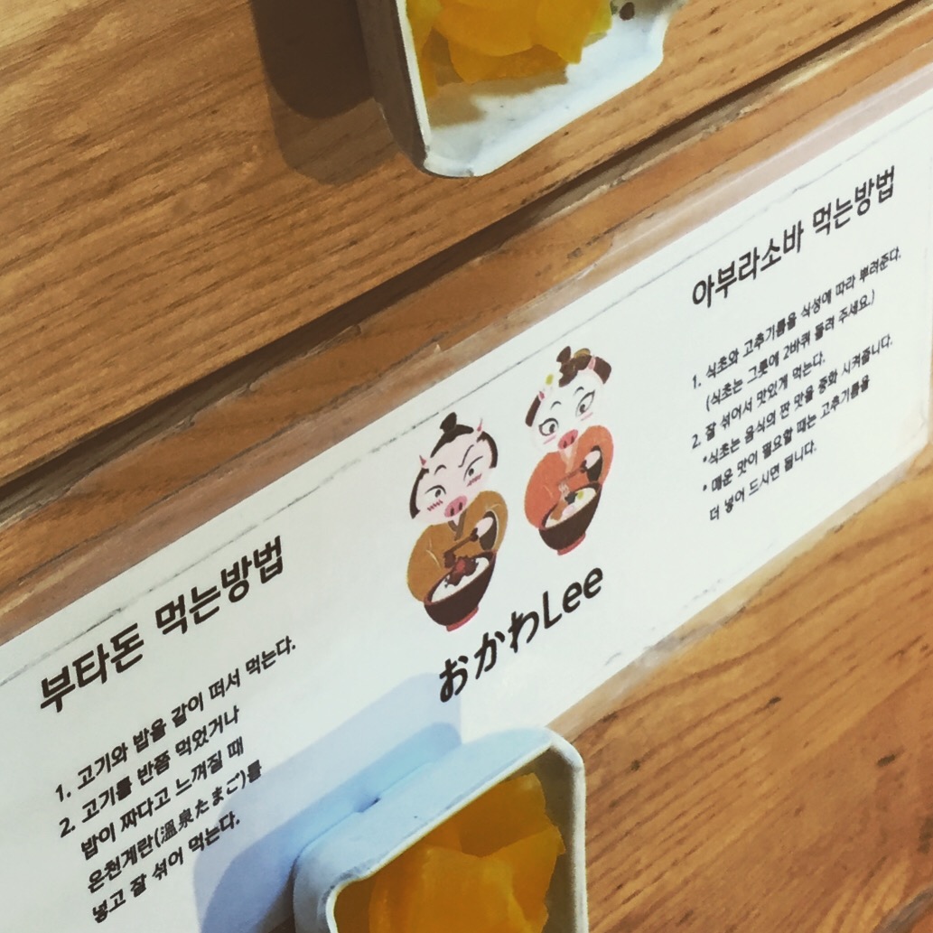 테이블에 붙어 있던 부타돈과 아부리소바 먹는 법.