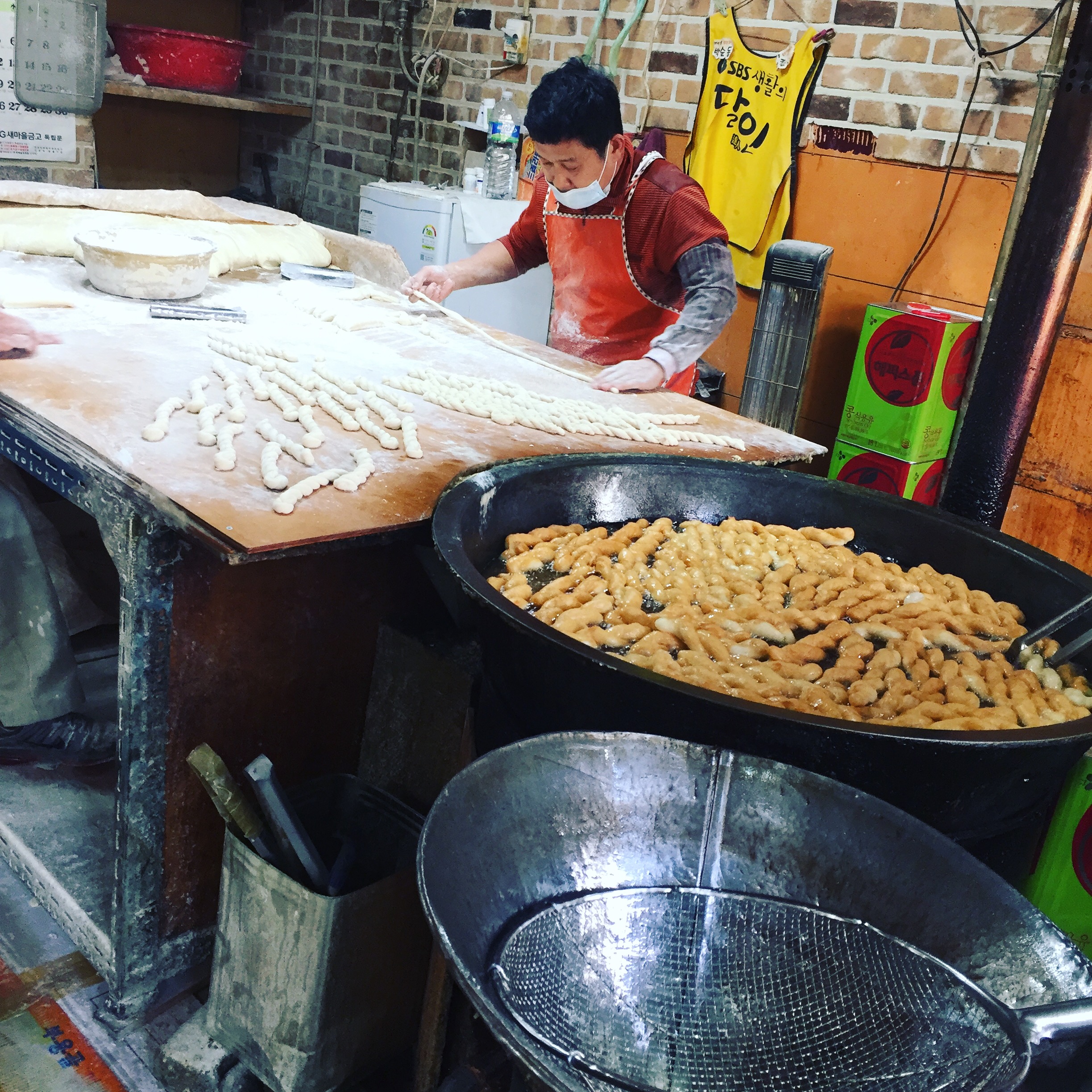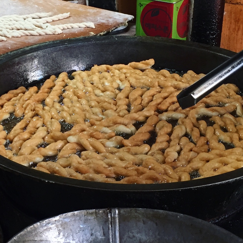 광활한 넓이의 꽈배기 반죽대와 역시 어마어마한 크기의 꽈배기가 튀겨지고 있던 솥. 사진으로는 그 느낌이 잘 전달되지 않는데, 실제로는 엄청나게 박진감 넘치는 모습이었다ㅎㅎ