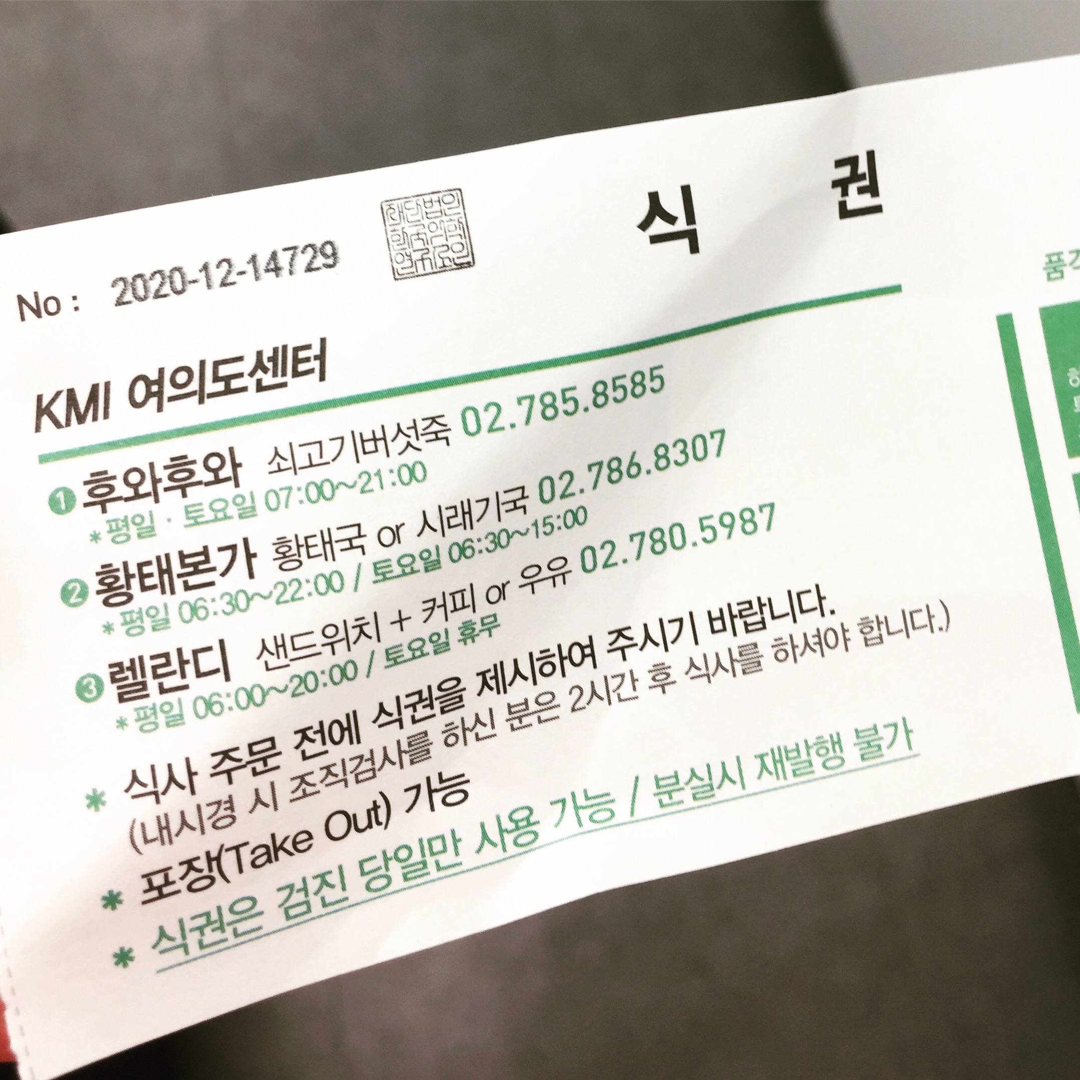 제목을 보고 의아해하신 분들이 있을지도 모르겠다. 대체 여의도 황태본가와 KMI 건강검진은 무슨 상관인가? 네 관계가 있습니다. KMI여의도 센터에서 건강검진을 마치고 나면 식권을 줍니다. (+건강검진 후기는 글 아래에...)