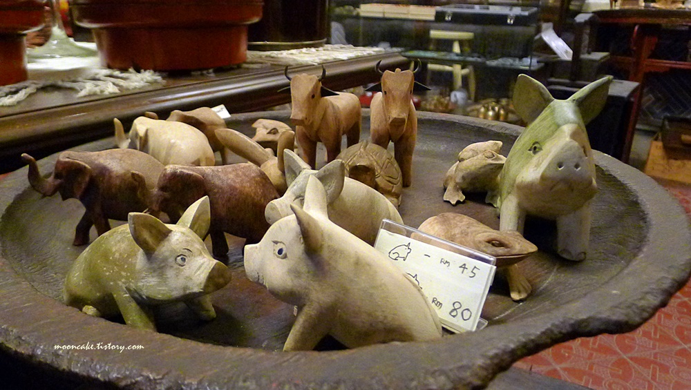 말라카는 거리 곳곳에 앤틱샵이 즐비해서 참 좋았다. 특히 그 중에서도 숙소 근처였던 앤틱샵이 참 근사해서 여러번 들렸는데 결국은 아무것도 사지 않았다. 마지막까지 망설였던 것은 사진 속의 목각 소. 원래 목각 제품이나 소를 좋아하진 않는데 저 소는 유독 눈에 들어와서 고민하다 호텔 체크아웃 시간이 촉박해서 결국 관뒀는데, 한마리 쯤 사와도 좋았을 걸. 그리고 그땐 눈에 안들어왔는데 사진을 보다보니 정면을 바라보고 있는 무처럼 생긴 큰 돼지(돼지 맞겠지?)의 표정도 심상치 않은 게, 상당히 귀엽다+_+