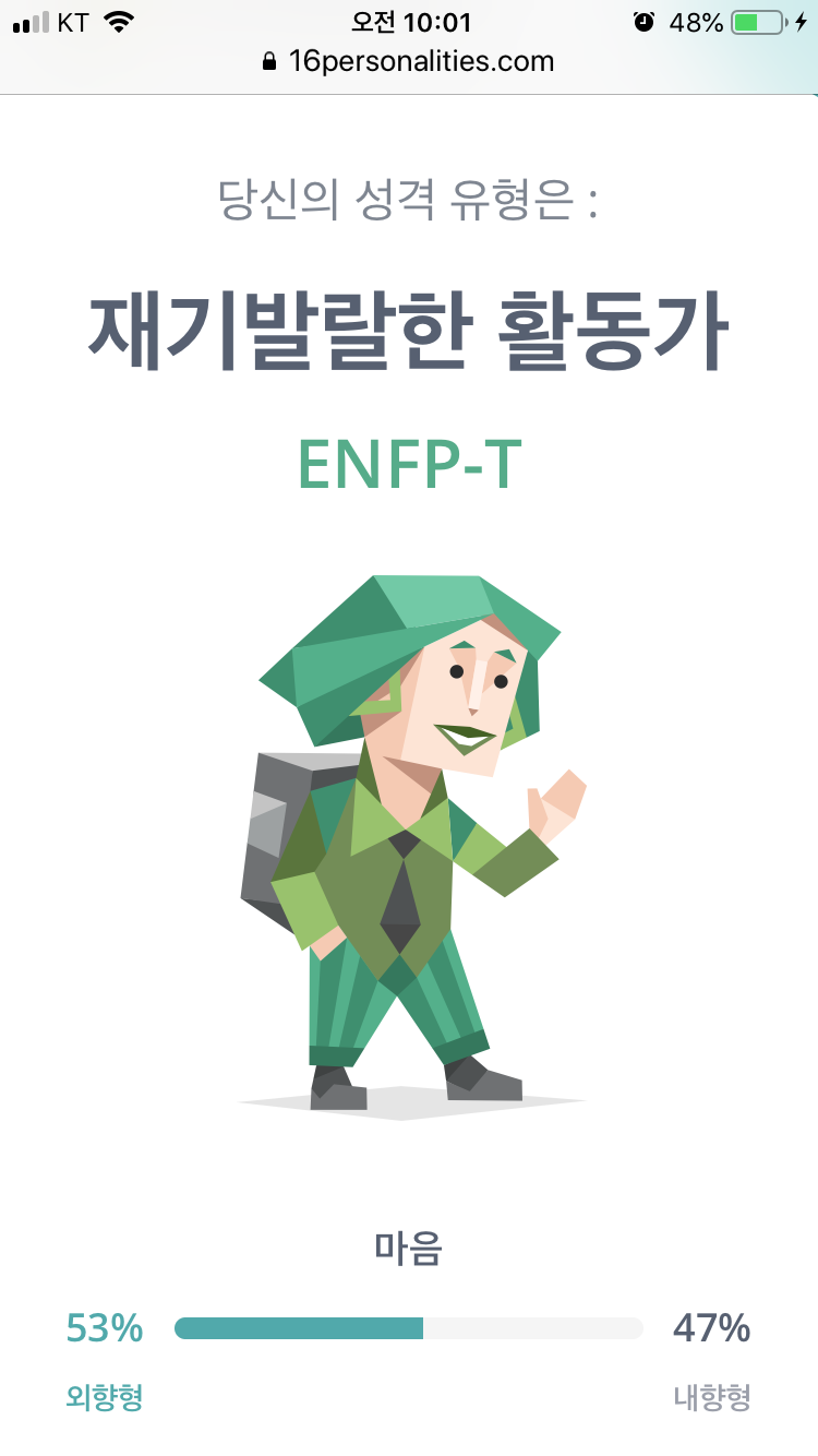 대학교 때 교내 심리상담연구소에서 MBTI 검사를 여러번 받았지만, 한번도 결과에 공감한 적이 없었다. 내 결과는 항상 ENFP(스파크형) 아니면 INFP(잔다르크형)이었는데 둘다 나랑 썩 잘 맞는 것 같지 않았다.