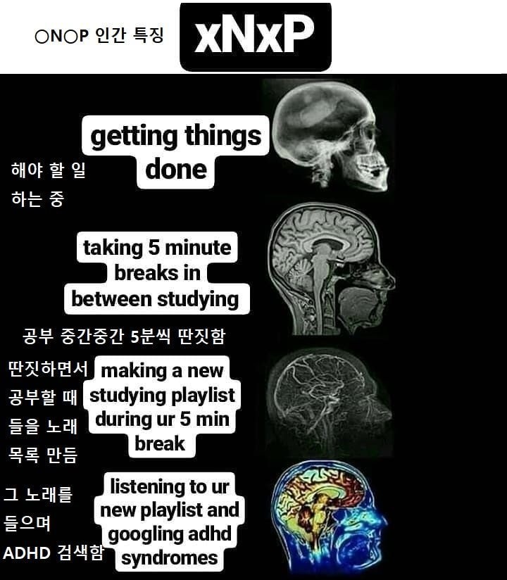 [MBTI] INTP 이상과 현실 INTP, ENTP, ENFP, INFP 유형의 학생들이 조별과제를 한다면 아래처럼 계속 미루다가 아무것도 안 할 거라고 과장해 표현한 짤입니다. NP의 특성이라고도 할 수 있겠네요. NP의 강�