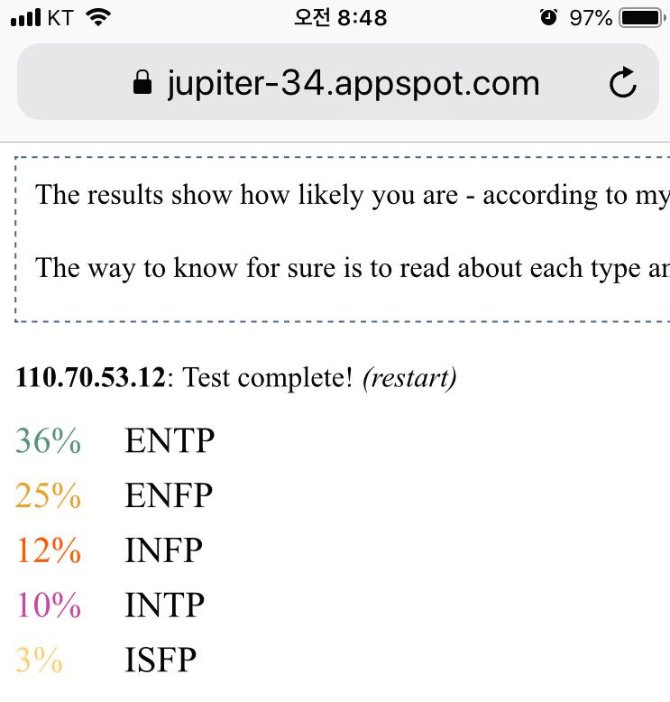 그런데... 몇달 전 영어 사이트에서 약식 MBTI 검사를 했을 때 난생 처음으로 ENTP가 튀어나와서 좀 신기했었다.