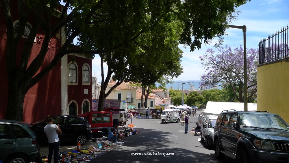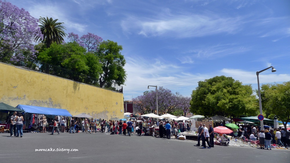 곳곳에 자카란다 꽃이 핀 알파마 지구의 벼룩시장.