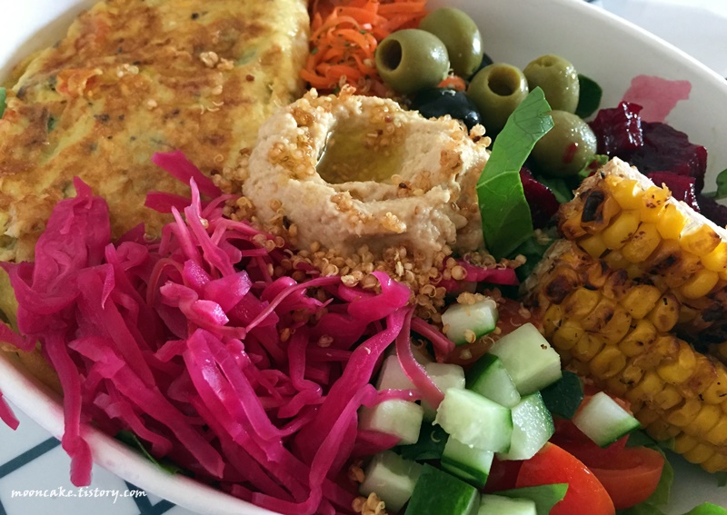 오믈렛도 엄청 묵직하고 실했고, 새콤달콤한 오렌지 비트와 올리브, 캐럿 라페, 구운 옥수수 등등 맛있는 재료가 가득했다. 특히 가운데에 있는 허니 후무스와 퀴노아가 정말 맛있었음. 고소한데다가 씹는 맛이 더해져서 기분이 좋아졌다.