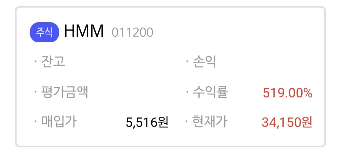 2018년부터 갖고 있었는데 최근에 500% 넘는 수익이 났다. (잔고랑 평가금액은 지웠어여;; 물론 그리 큰 금액은 아닙니당;;) 작년처럼 좋은 장에 여러 사정상 주식투자를 거의 하지 못해 상대적 박탈감이 들었는데 그래도 HMM이 나를 위로해 주고 있다.