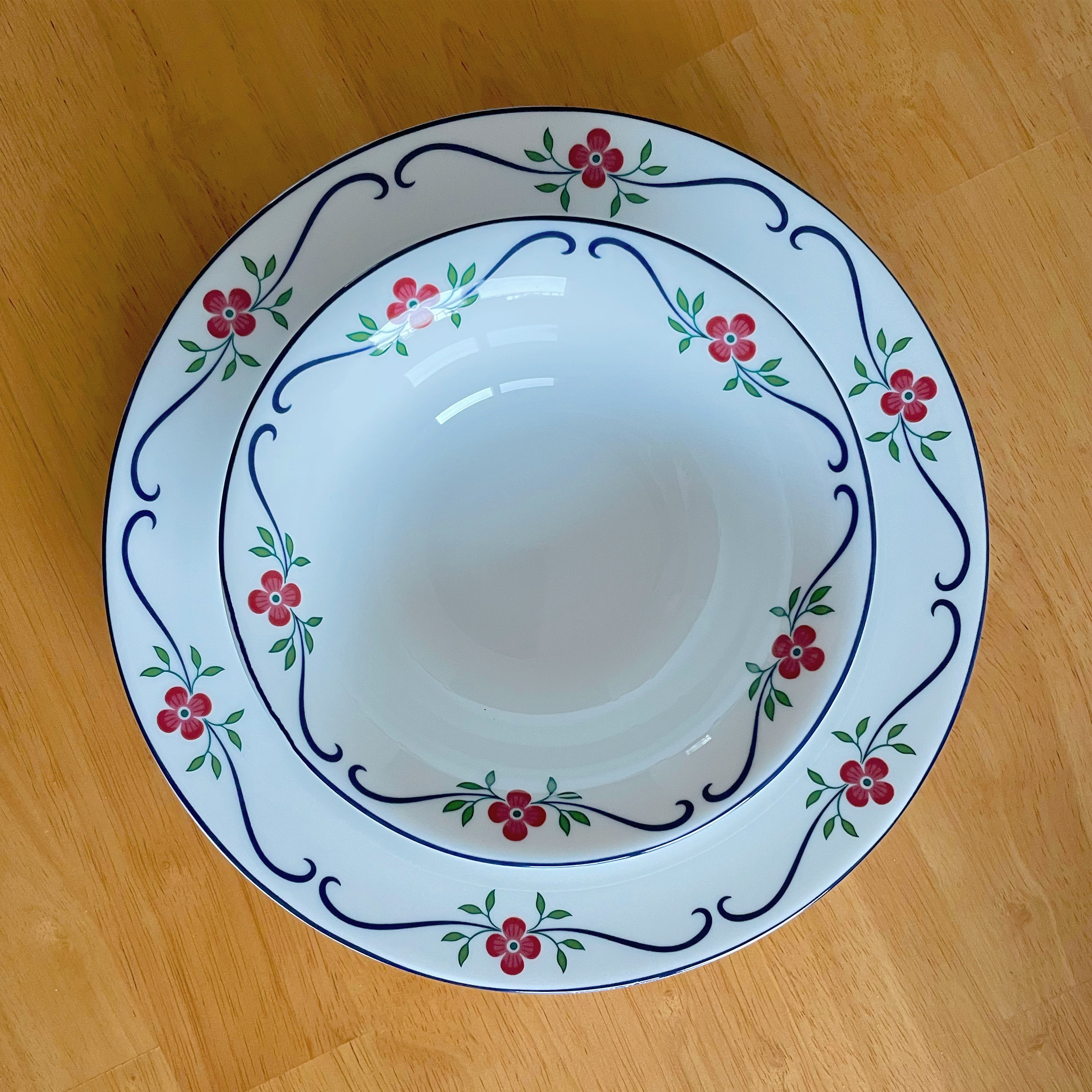 디자인은 정말 마음에 든다. 일상생활용 그릇으론 제일 마음에 드는 패턴이다. 어릴때 좋아했던 인형의 집 식탁에 있던 수프 그릇과 비슷한 패턴이어서 더 마음에 든다. 그런데 품질은 가격 만큼 좋지는 않은 것 같다. 일단 16cm 볼에서 라인이 너무 크게 어긋난 부분이 있구 (9시 방향 살짝 아래를 보시라) 이건 뭐 핸드페인팅 특징이라 그러려니 할 수 있지만 24cm 플레이트는 그릇 자체가 균일하지 않은 느낌이 있다, 이것도 음식을 담으면 티가 안나니 그러려니 할 수 있는데, 결정적으로 스크래치가 있다. 새 그릇인데 칼에 베인 듯 한 작은 스크래치가 두 개! 쓰기 전부터 스크래치라니 이거슨 심란하다. 이대로 써야 할지 말아야 할지, 하지만 외국에서 오는 거라 교환이 번거롭구. 에궁.....