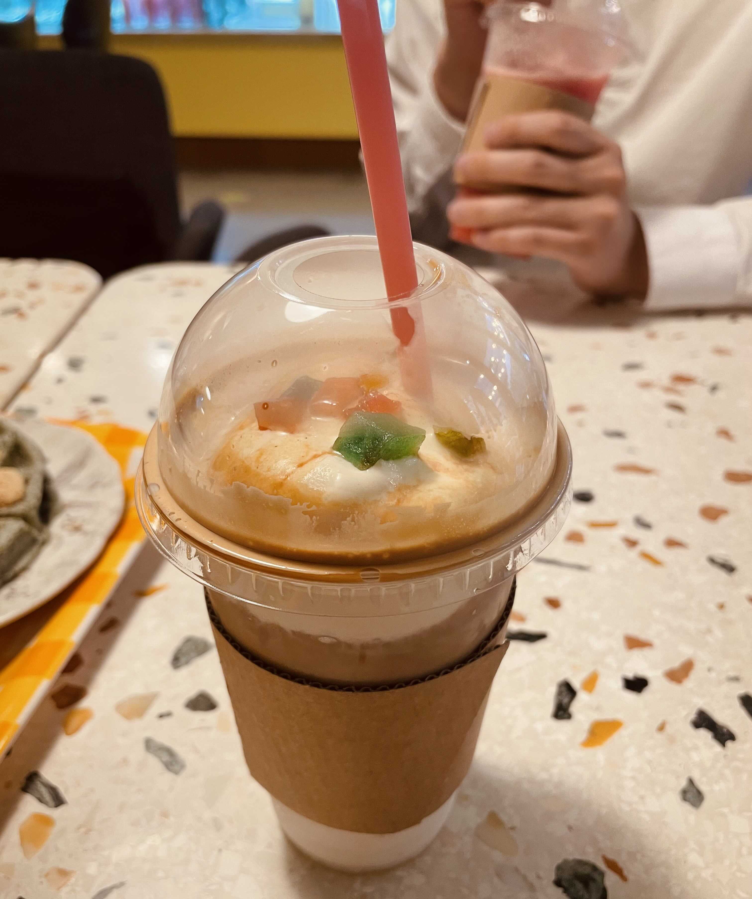 내가 고른 건 보석라떼였는데, 솔직히 말해서 이름만 보고 예쁜 비주얼을 기대하고 주문한 메뉴였다. 그래서 음료가 나왔을 땐 라떼+아이스크림 위에 보석 젤리 몇 알 올라간 모습에 다소 실망했지만, 마셔보니 참 맛있어서 잘 골랐다고 생각했다. 아이스라떼와 바닐라 아이스크림의 조합은 흔한 메뉴이지만 간을 잘 맞췄다고 해야 하나 (커피에 쓰기는 이상한 표현인데 실제로 그러함ㅎㅎ) 암튼 강추!