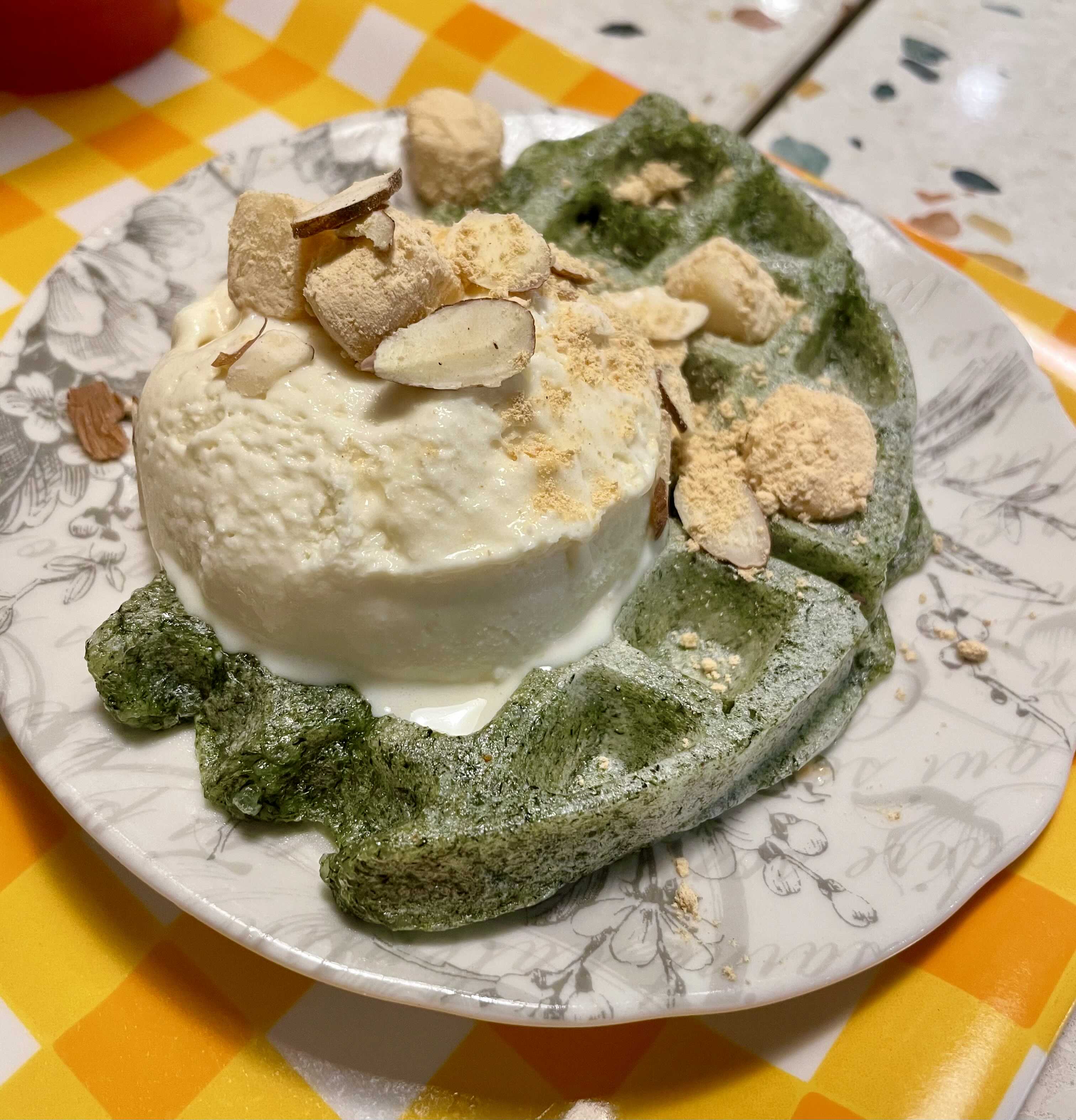 쑥떡 와플에 아이스크림과 인절미, 아몬드 토핑.