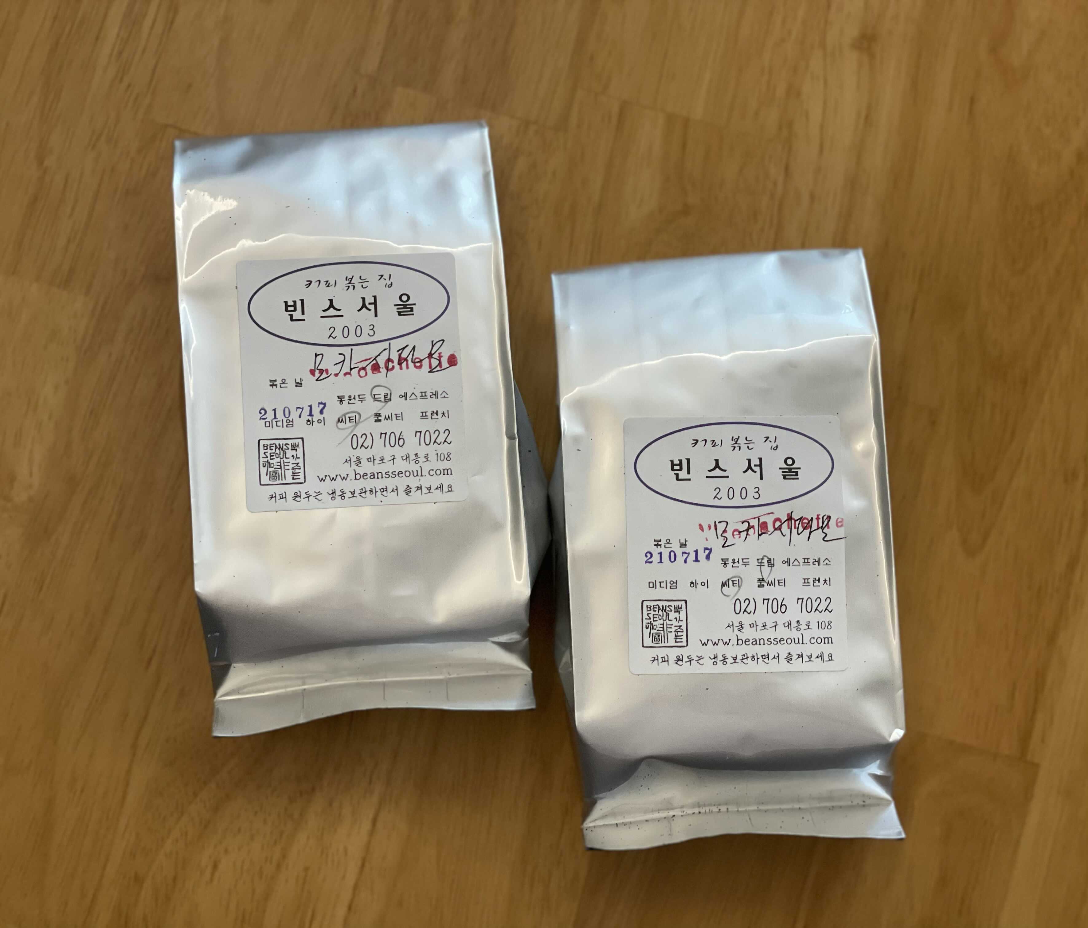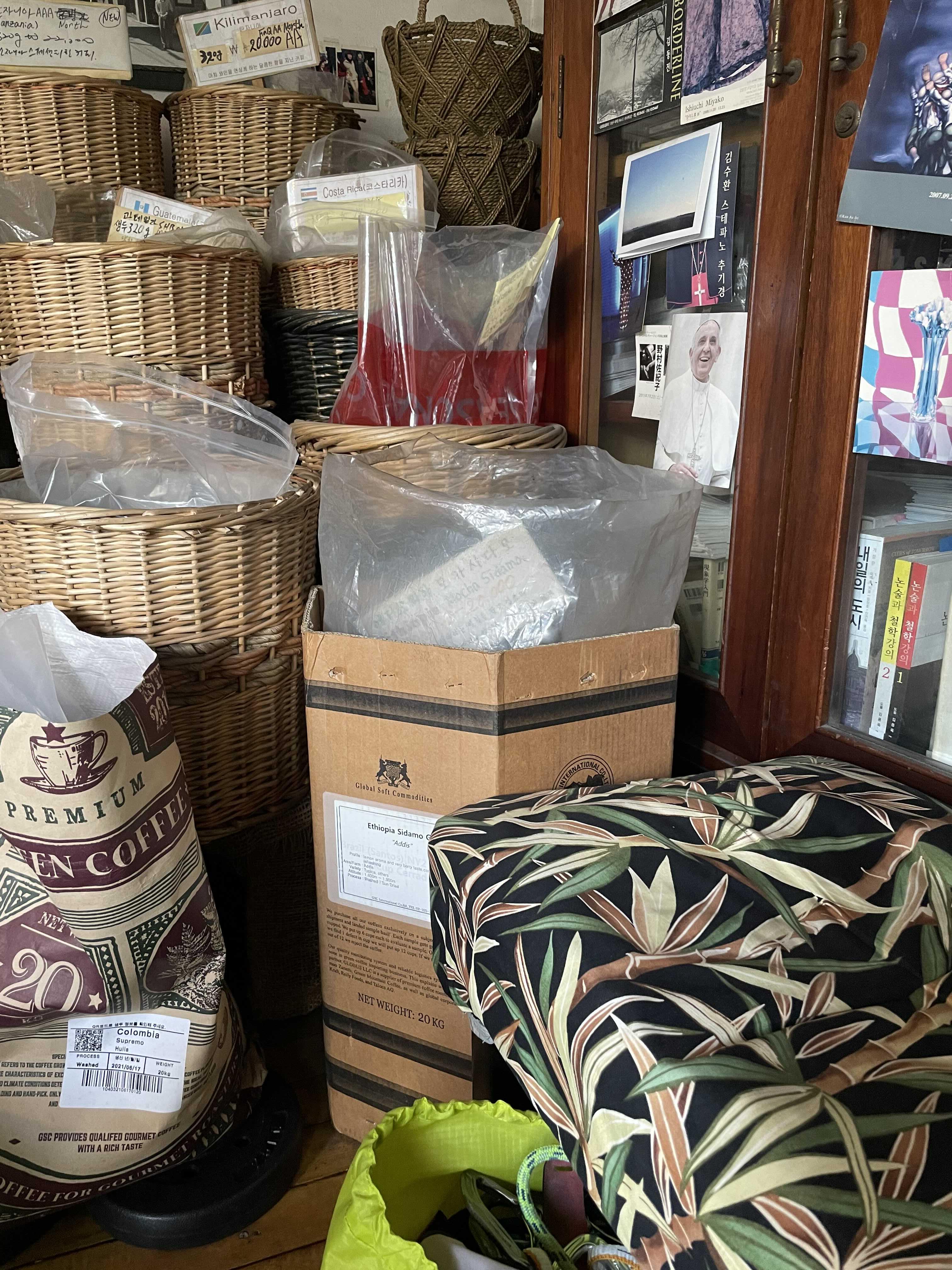 이때쯤 다른 손님이 한명 더 들어와 나랑 똑같은 에티오피아 예가체프를 주문했는데, 그때 마침 내눈에 에티오피아 모카시다모 원두가 눈에 들어왔다. (사진 속 대나무 패턴의 패브릭 커버를 씌운 의자 앞) 아니 내가 찾던 원두가 빈스서울에 있었잖아?!!! 그래서 실례를 무릅쓰고;; 어차피 내 이후에 온 분이 같은 원두를 주문하셨으니 이미 볶고 있었던 내 원두는 나중에 오신 분께 드리고, 나는 모카시다모를 구입하면 안되겠냐고 여쭤봤더니 흔쾌히 그렇게 해주셨다.