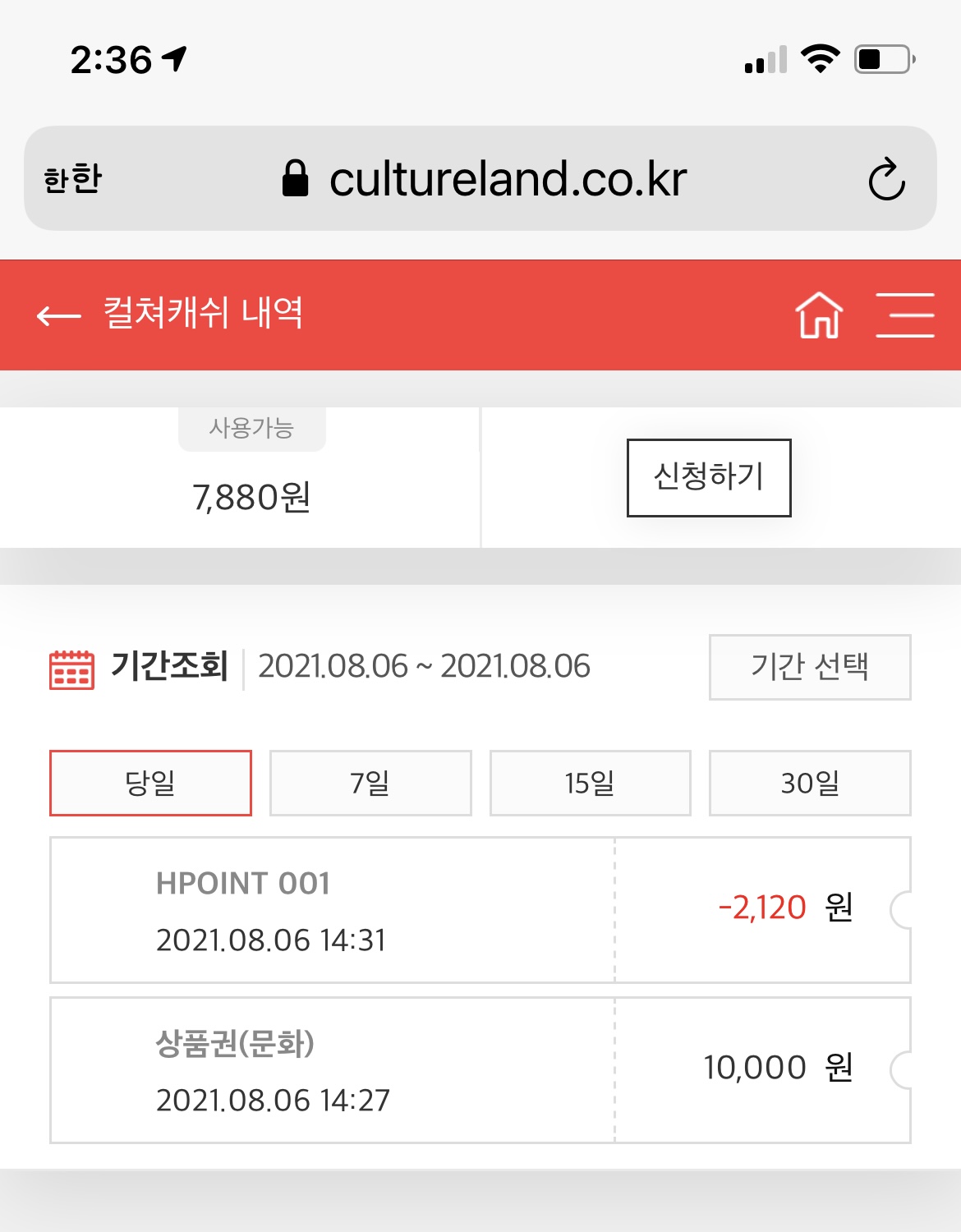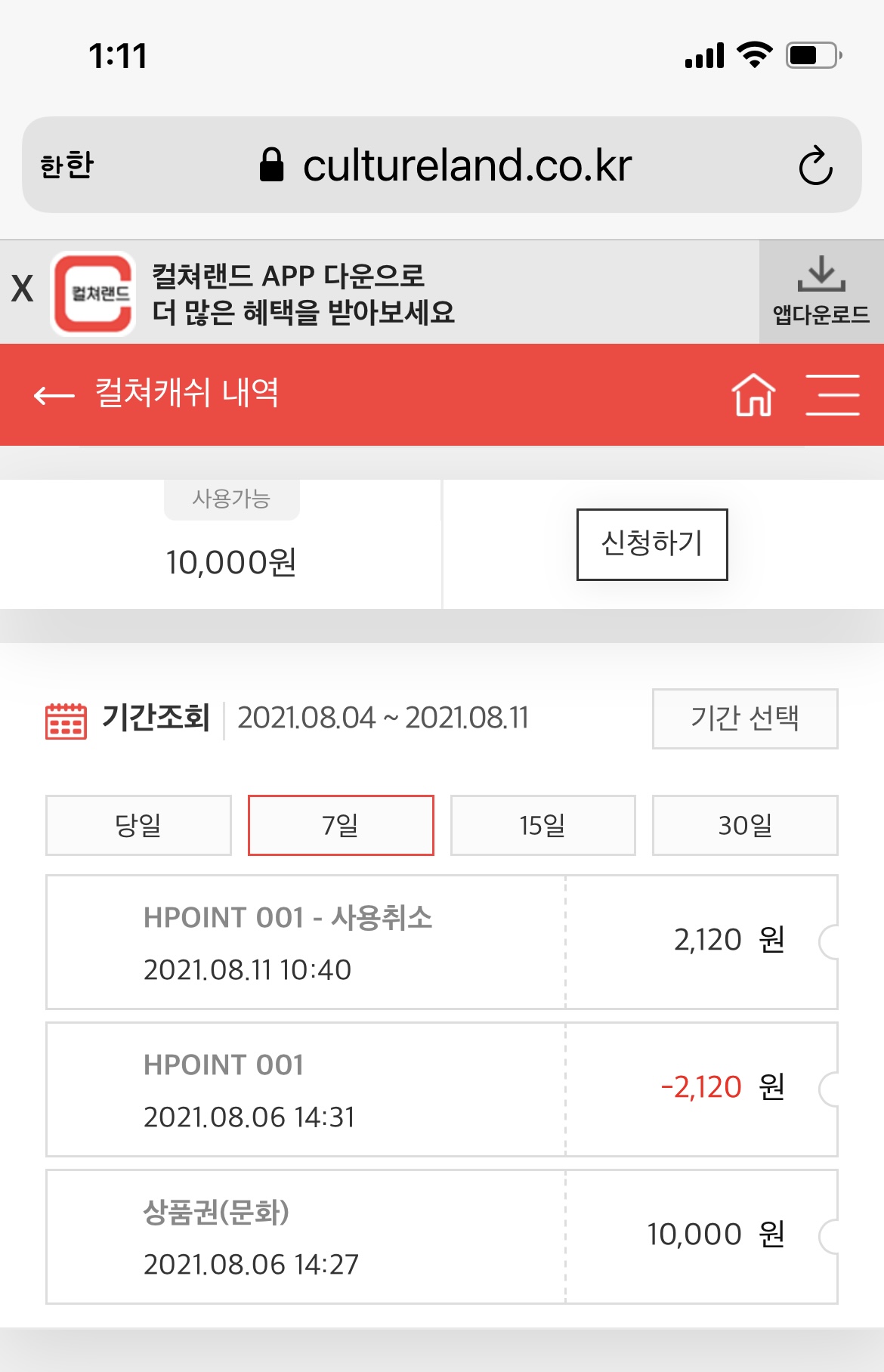 지난주 금요일, 몇년동안 굴러다니던 문화상품권이 한장 있어서 써볼까 하고 컬쳐랜드 사이트에 등록을 했다. 그 다음 더현대 앱에서 쇼핑을 하려고 H point로 전환할까 싶어 H point 앱을 깔았지만, 전환 수수료가 6%길래 잠시 고민하다 전환하지 않고 앱을 껐다. 그다음, 다른 사용처를 확인하기 위해 컬쳐랜드 사이트에 접속했더니 포인트 2,120원이 사라져 있는 것이다!!