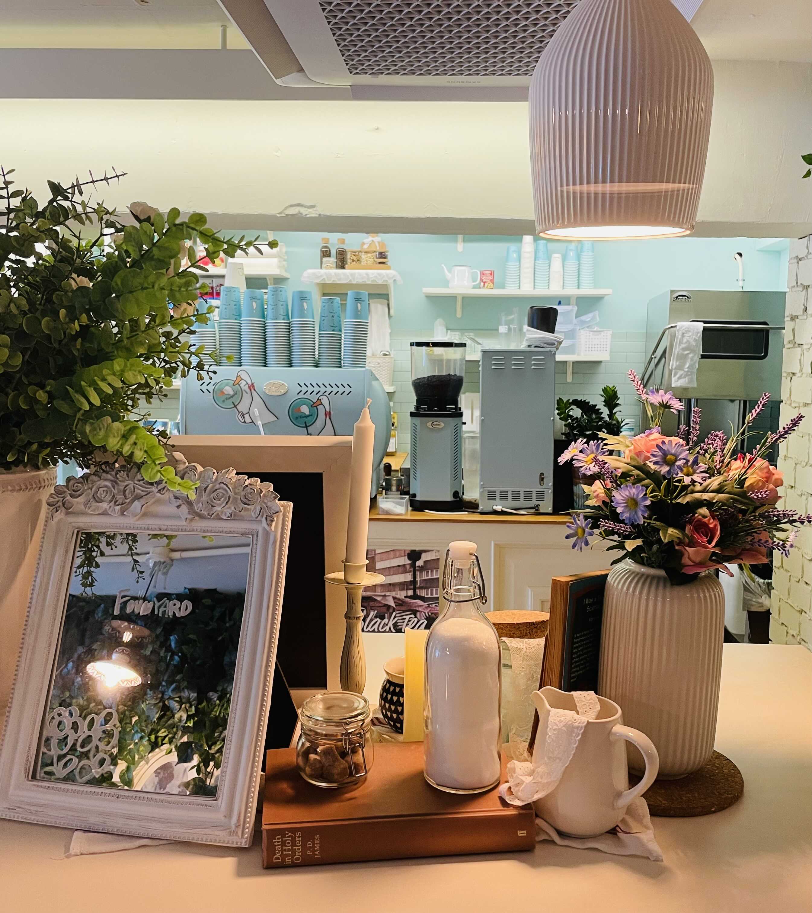 가게 컨셉에 맞춘, 민트색 커피며신과 각종 기계들.