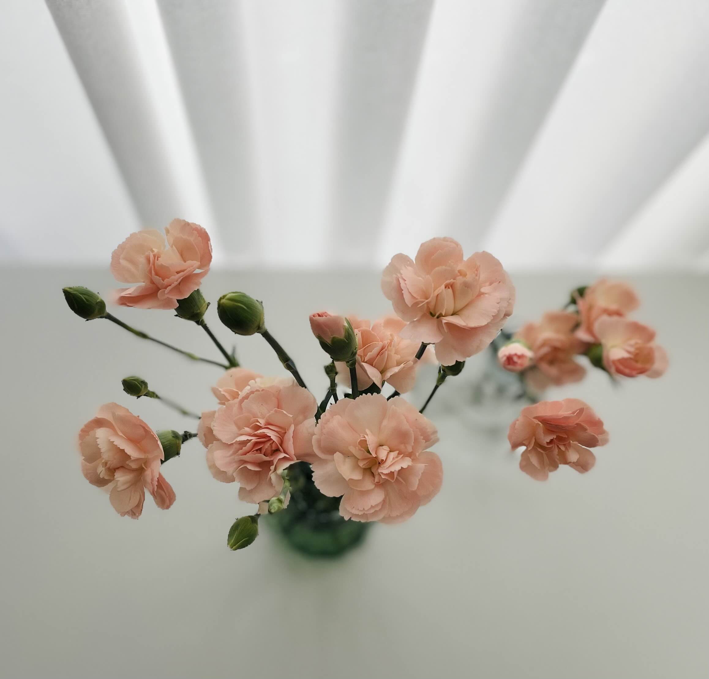 어제 병원에 다녀오다가 꽃을 샀다. 바깥에 진열된 꽃들이 예뻐서 잠시 바라봤는데, 꽃집 사장님이 밖으로 나와 적극적으로 영업하시는 바람에 얼결에 카네이션을 샀다. 1대에 2천원, 총 6천원. 내 손으로 집에 놓을 꽃을 사는 건 정말 오랜만이다. 고등학교 때 학교 앞에 가끔씩 오던 꽃트럭에서 안개꽃이나 노란 프리지아를 산 게 마지막이지 싶다.