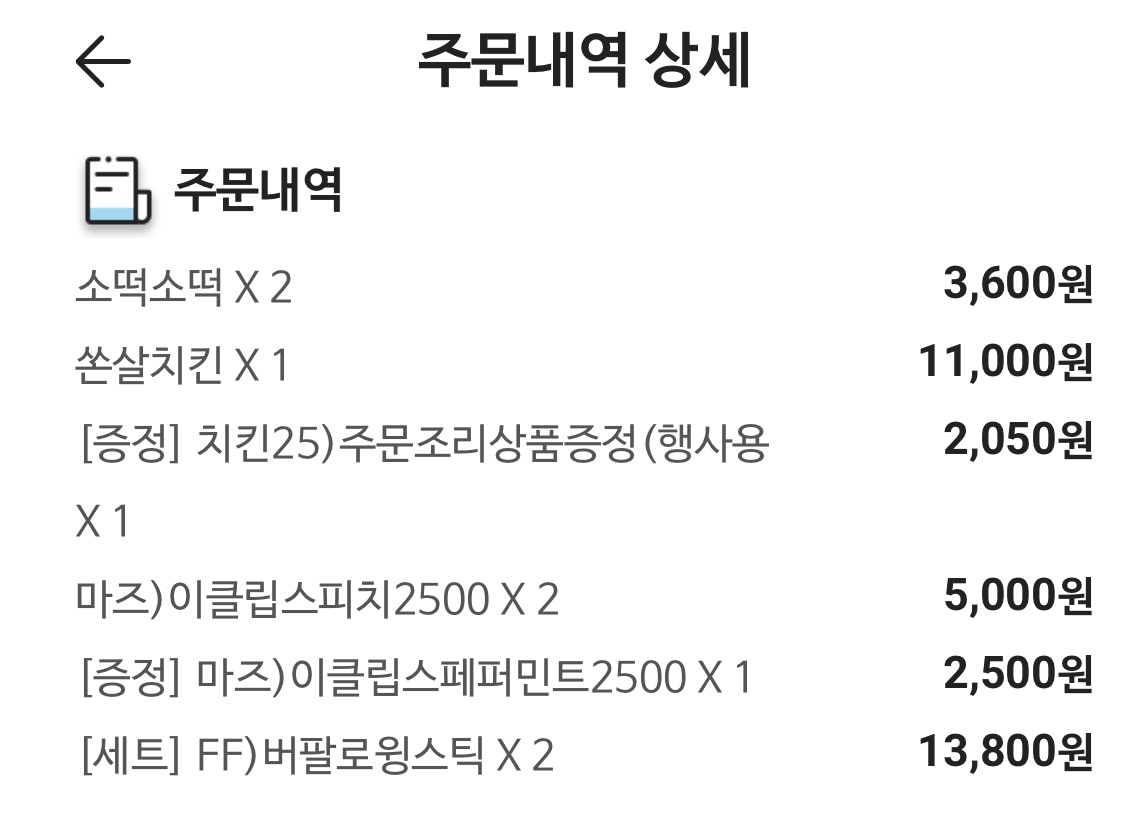 소떡소떡, 쏜살치킨, 버팔로윙스틱에다가 할인쿠폰 사용 금액 채우려고 이클립스까지 구입ㅎ