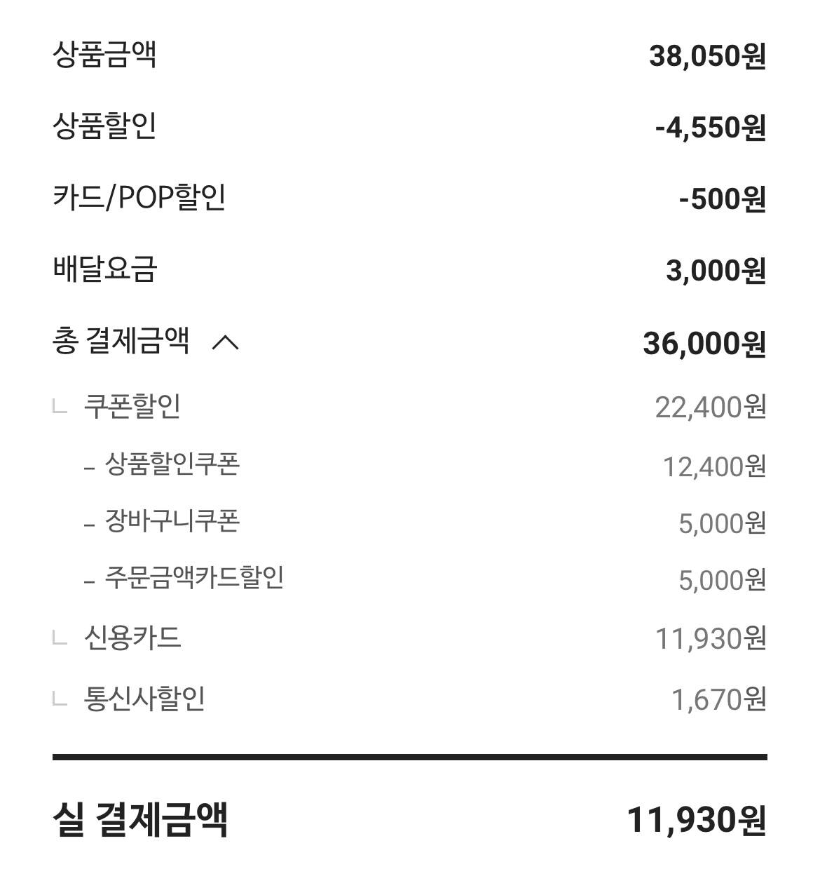 그래서 원래 총 금액은 38,050원인데 (물론 할인이나 행사 하나 없이 저 금액이라면 절대 주문안했겠지만;;) 온갖 할인을 갖다 붙이고 나니 최종 결제금액은 11,930원. 그리고 신한더모아카드로 계산했으니까 930원도 캐시백 예정이다.