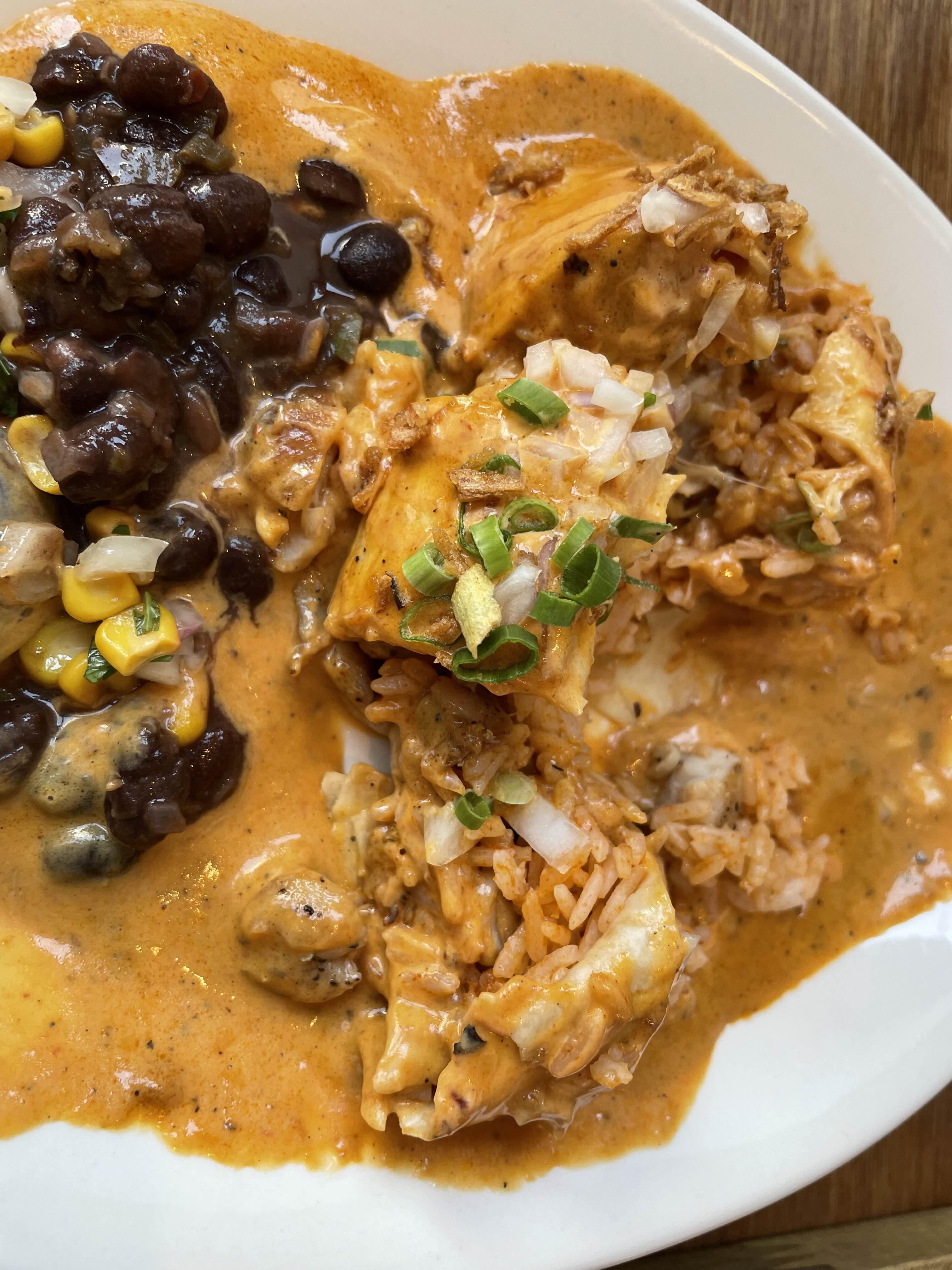 엔칠라다 속은 치킨이랑 멕시칸 쌀요리로 가득 채워져 있었습니다. 곁들여지는 콩요리도 맛있어요. (원래는 콩 싫어하는데 멕시칸 음식점에서 나오는 콩요리는 잘 먹음;;;)