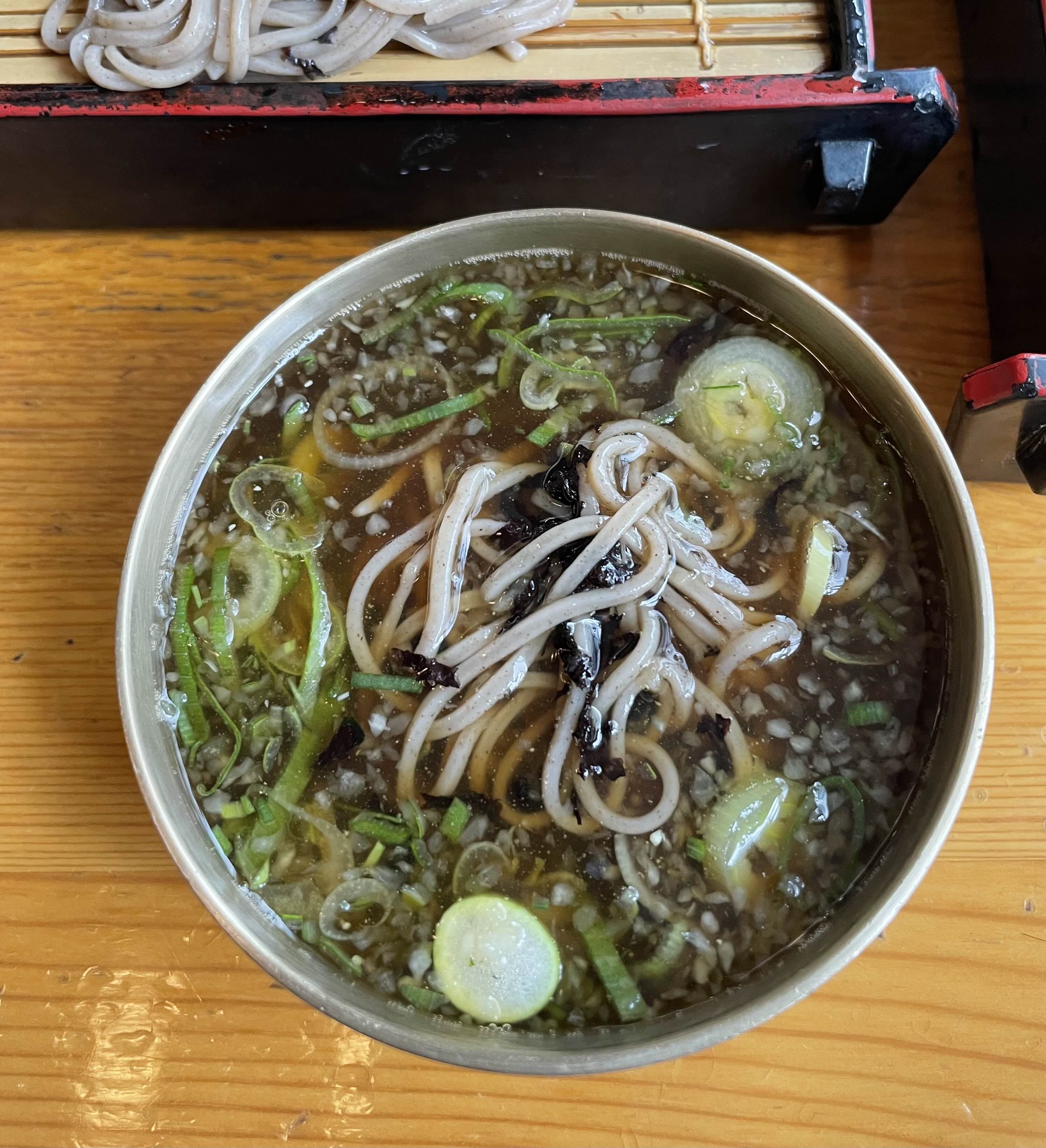겨자와 파를 넣고 메밀 국수를 담가 먹는다. 메밀간장육수가 달달하다. 맛있다.