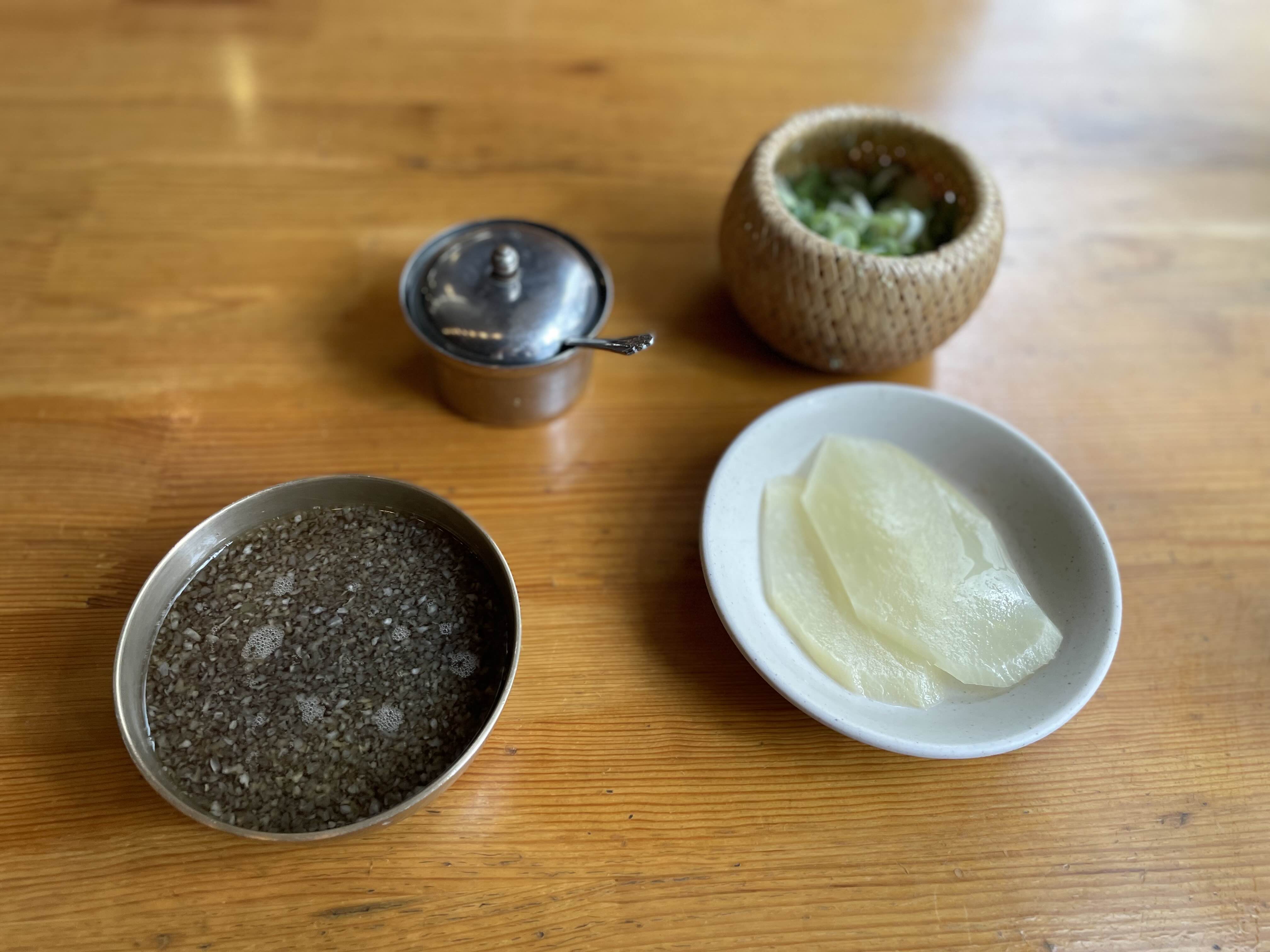 자리에 앉자마자 겨자와 파, 메밀간장, 그리고 단무지가 놓여졌고