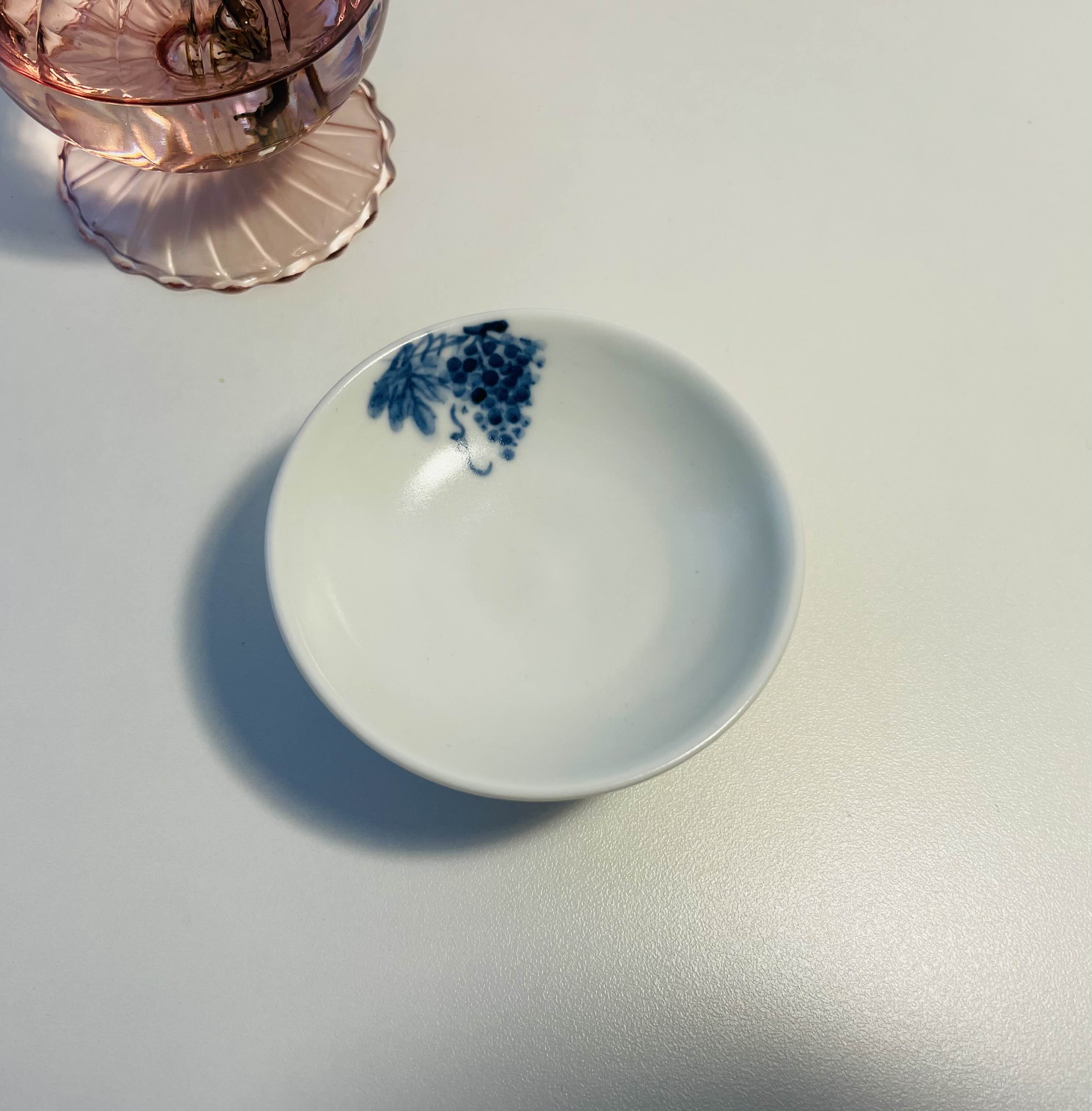 내가 데려온, 포도 문양이 그려진 굽이 있는 작은 종지.