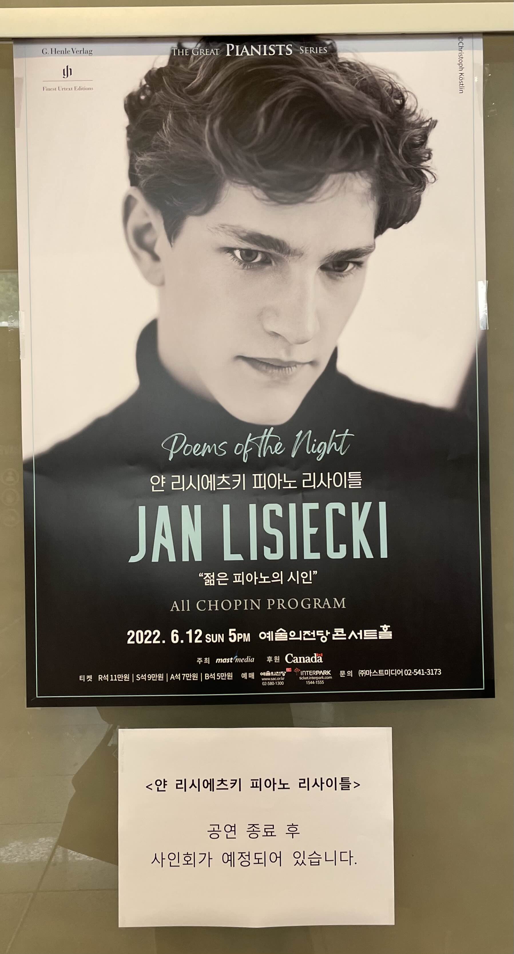 예술의 전당에 갔더니 역시나 사인회 예정 공지가 붙어 있고 로비에서 씨디 3종을 판매 중이었어요 (녹턴, 쇼팽 works for piano and orchestra, 그리고 Night music이었나…) 2018년 얀 리시에츠키 리사이틀엔 씨디를 한 장만 들고 갔는데 다른 사람들이 싸인 두개씩 받는 거 보고 부러웠던지라, 쇼팽 에뛰드 씨디를 들고 가긴 했지만 녹턴 씨디를 또 샀습니다. (그러나 쓸데없는 짓이었다는 ㅋㅋ)
