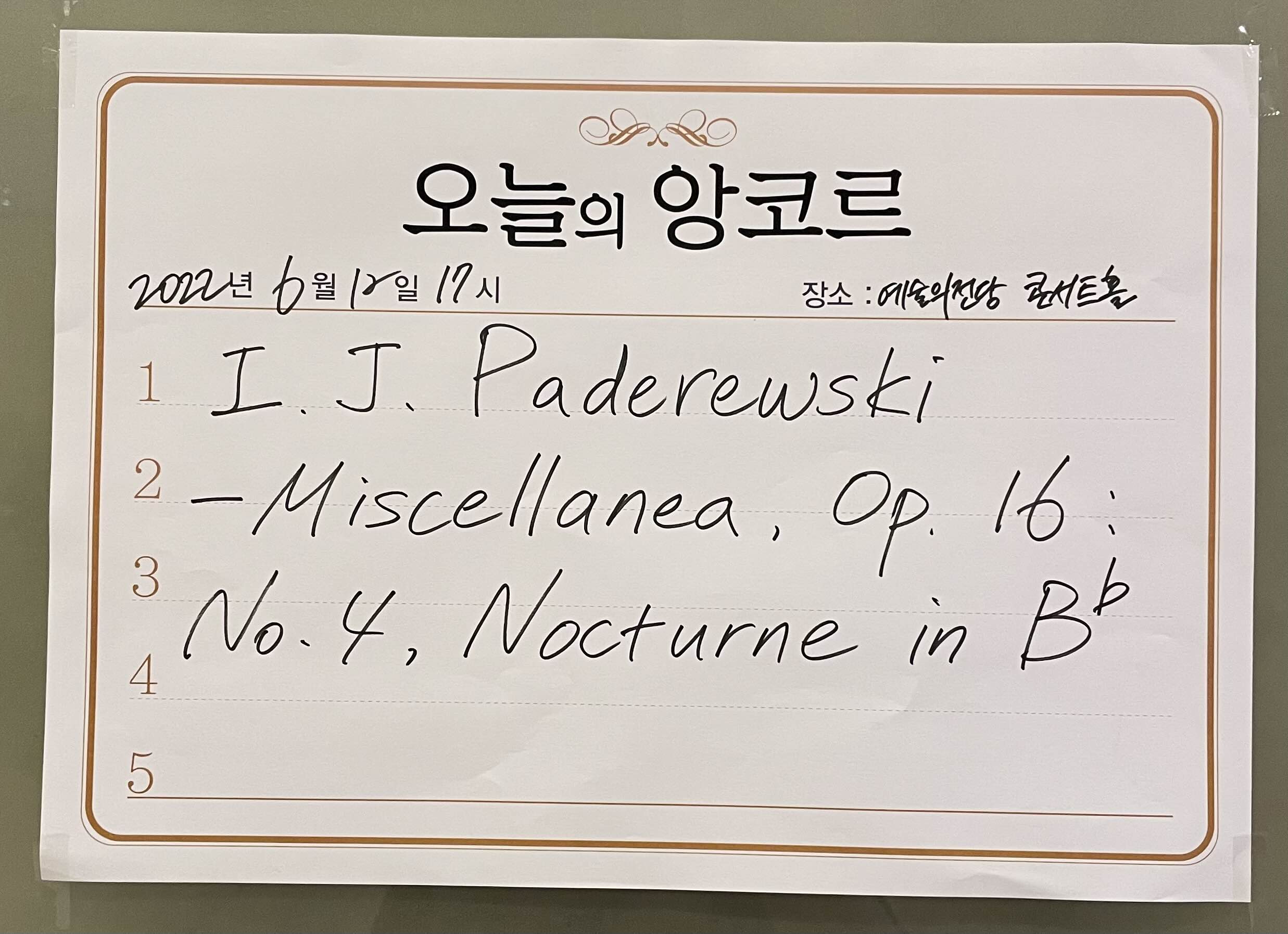 오늘의 앵콜이 뭘까 파데레프스키였으면 좋겠다라고 생각하긴 했는데 얀 리시에츠키가 앵콜곡을 연주하러 나와서 굿 이브닝, 이 곡은 쇼팽은 아니고 파데레프스키에요 라고 할때 저도 모르게 우와! 했는데 심지어!!!!!