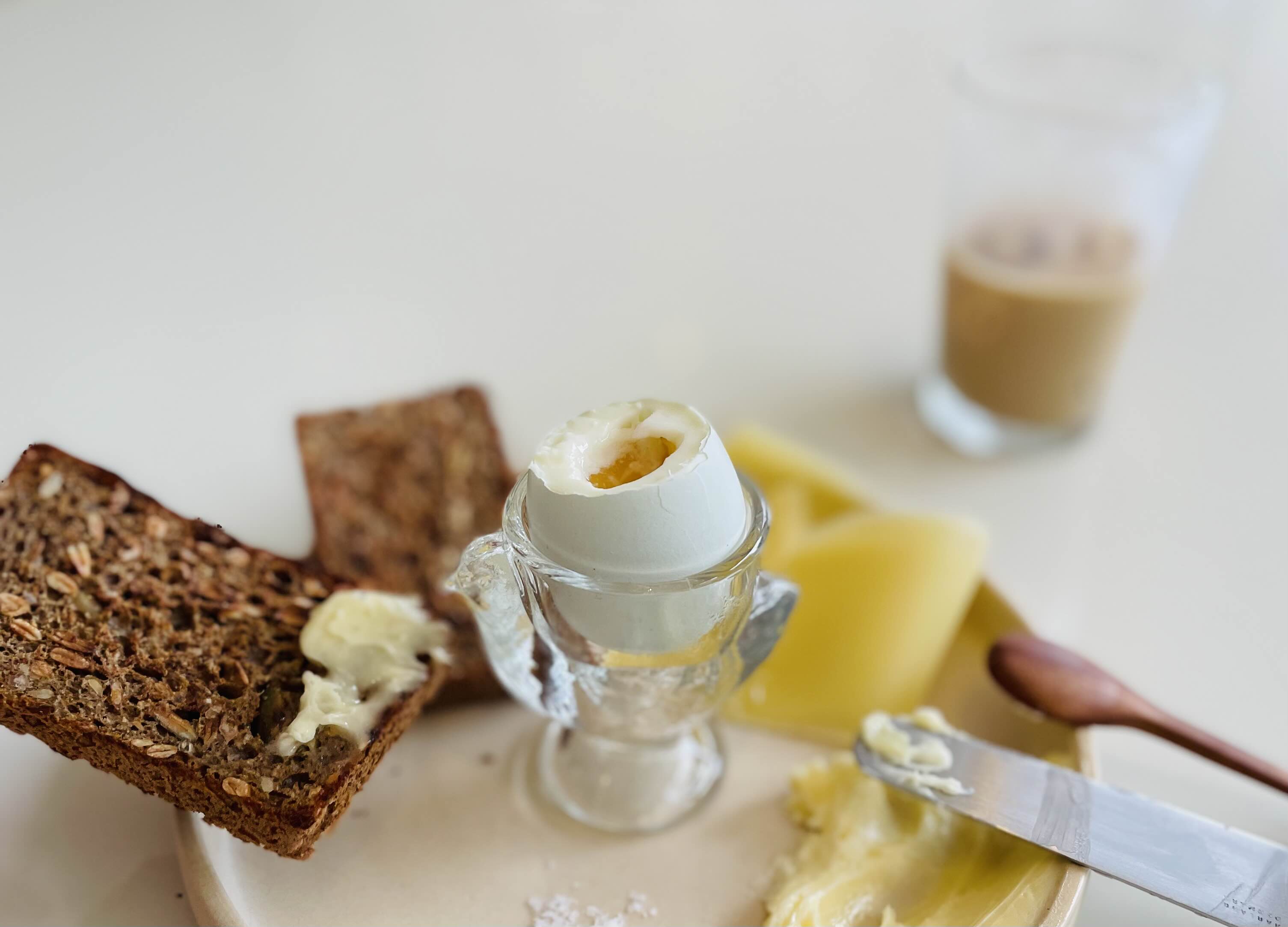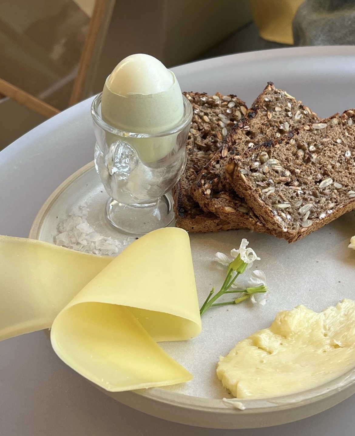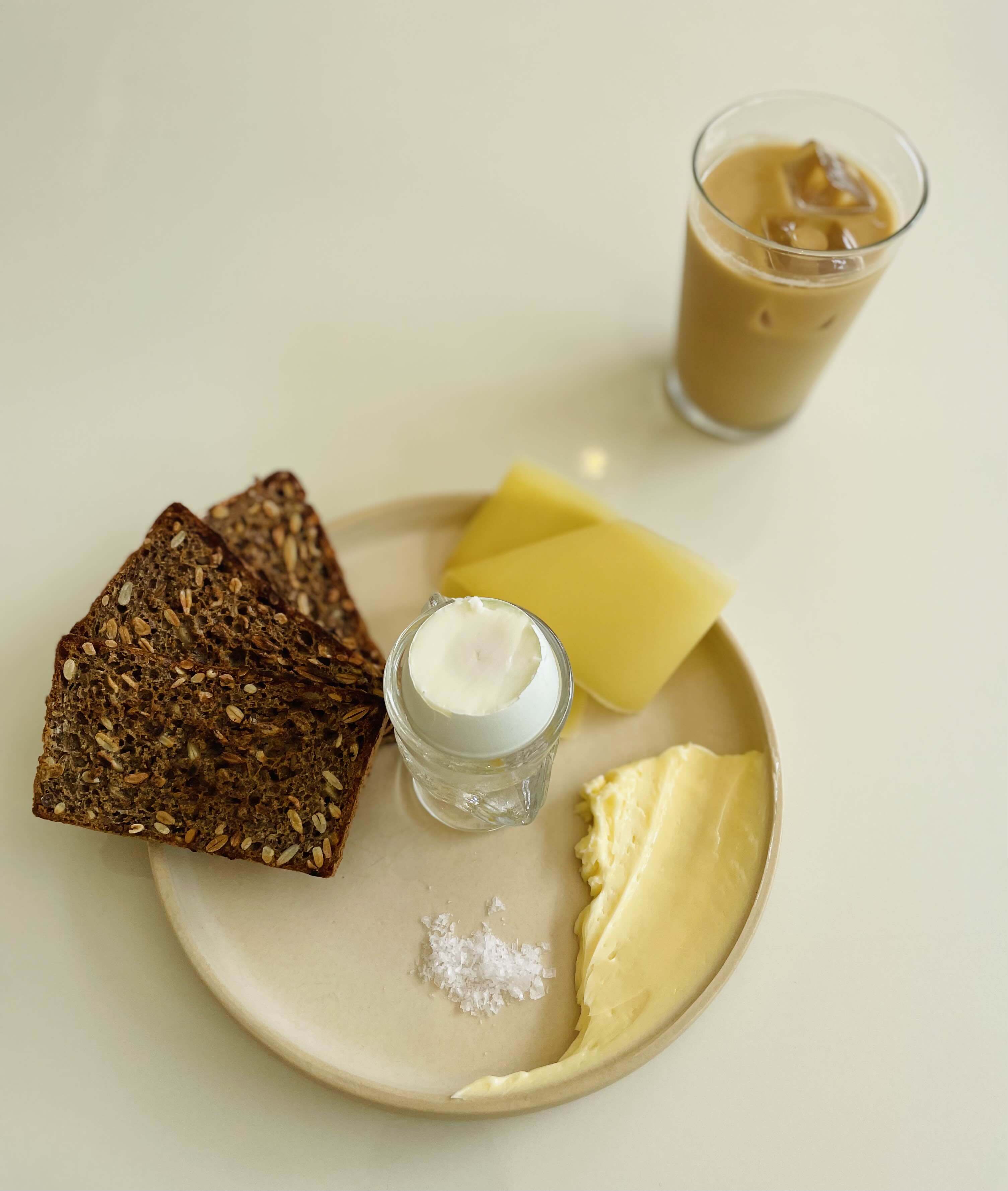 ***직접 구운 덴마크 라이브레드 3조각, 대니시비키퍼스 봄꿀버터, 프랑스6개월 꽁테치즈, 방목한 청계가 낳은 청란, 말돈소금***으로 구성된 메뉴입니다.