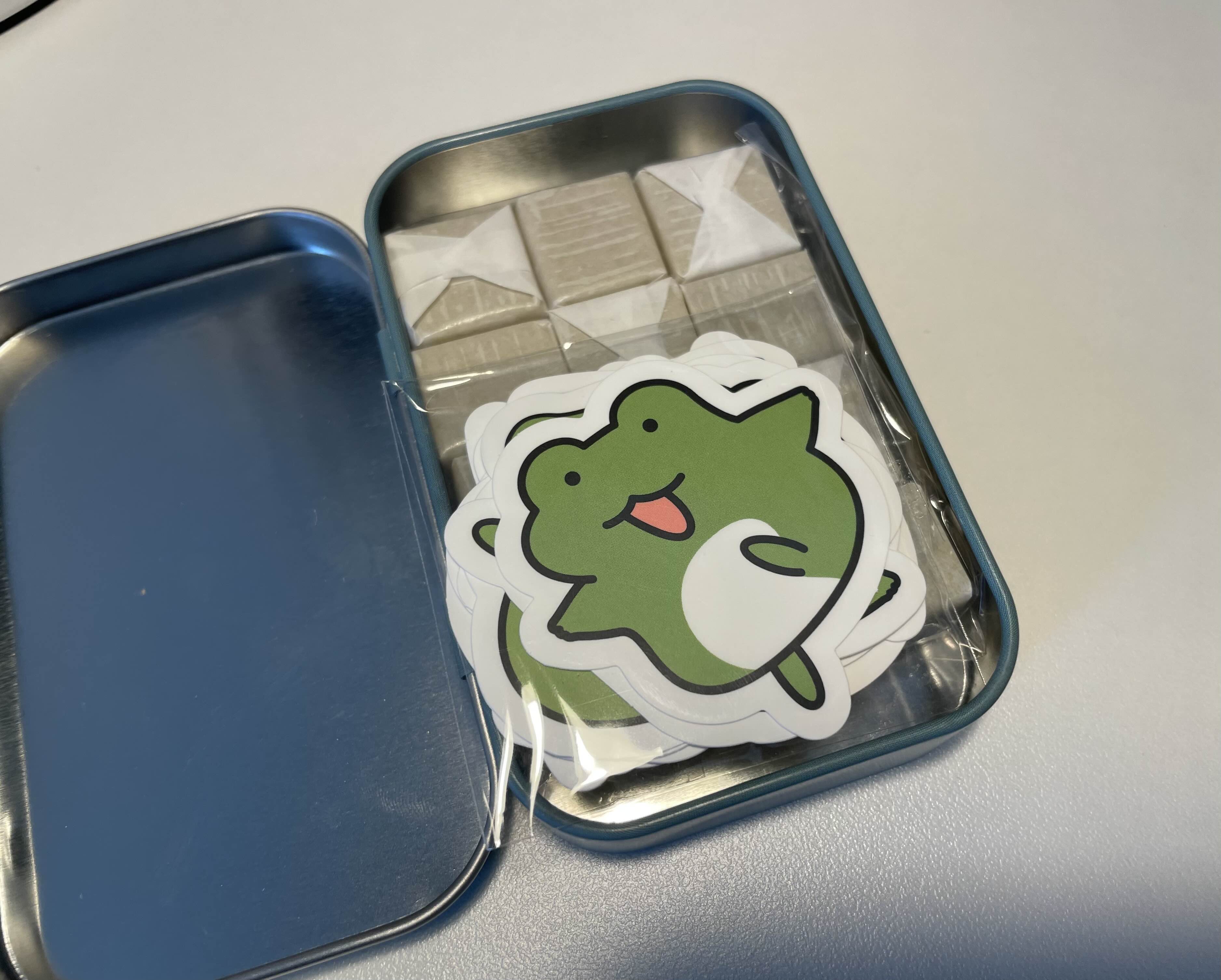 개구리 스티커가 들어 있는 샤인 머스캣맛 캬라멜이에요.