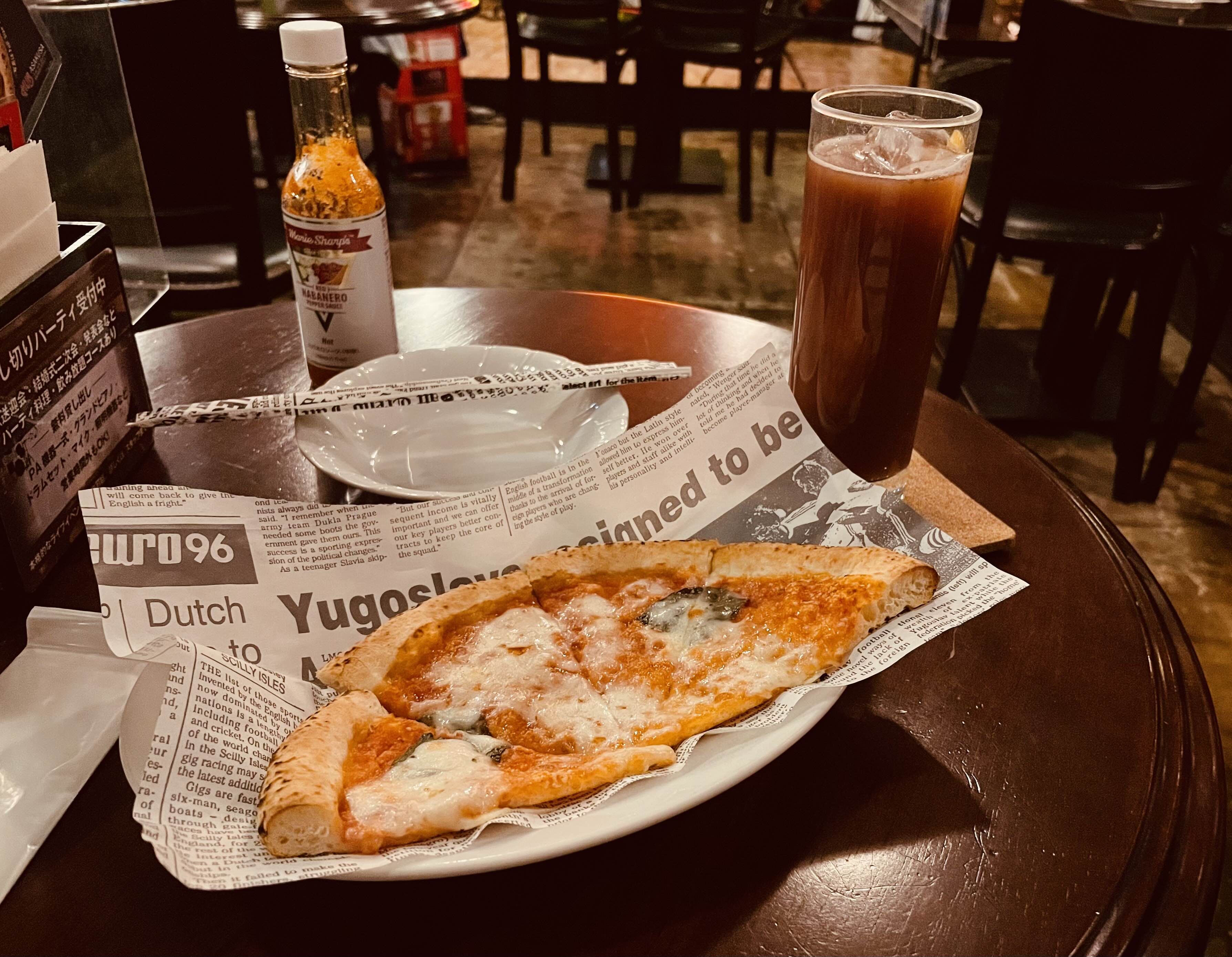 이른 저녁을 먹고 갔지만 다들 술+안주를 먹고 있길래 눈치껏 주문한 마르게리타 피자 하프 사이즈. 근데 결국 다 먹어치운 거 실화냐ㅋ 카시스 오렌지는 무난한 맛이었다. (호텔 바에서 내가 크렘 드 카시스를 콜라에 타 먹는 게 더 맛있..)
