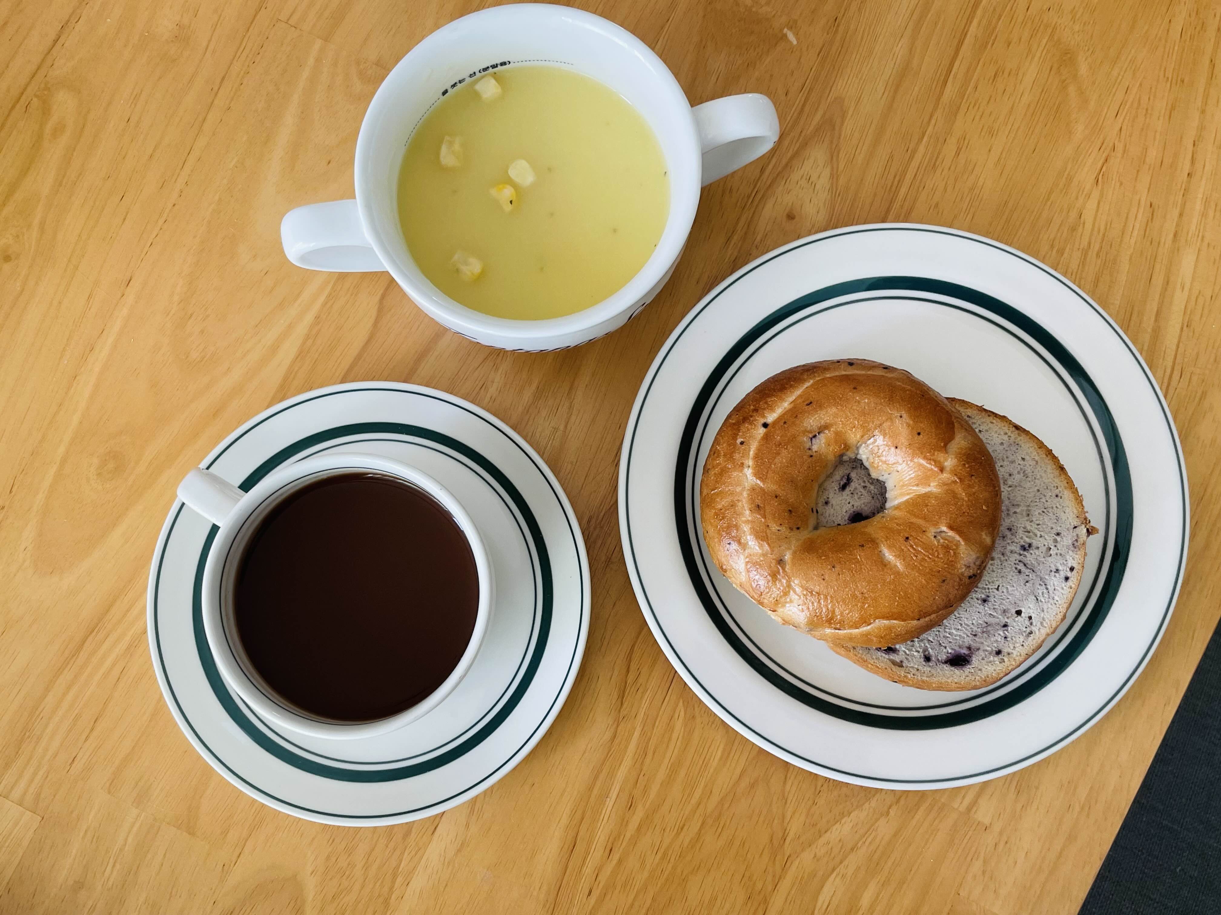카네수즈 찻잔에 허쉬100%코코아가루랑 알룰로스로 핫초코를 타서 마시려다가, 마침 점심 시간이라 옥수수수프랑 블루베리베이글을 같이 준비했다🧡