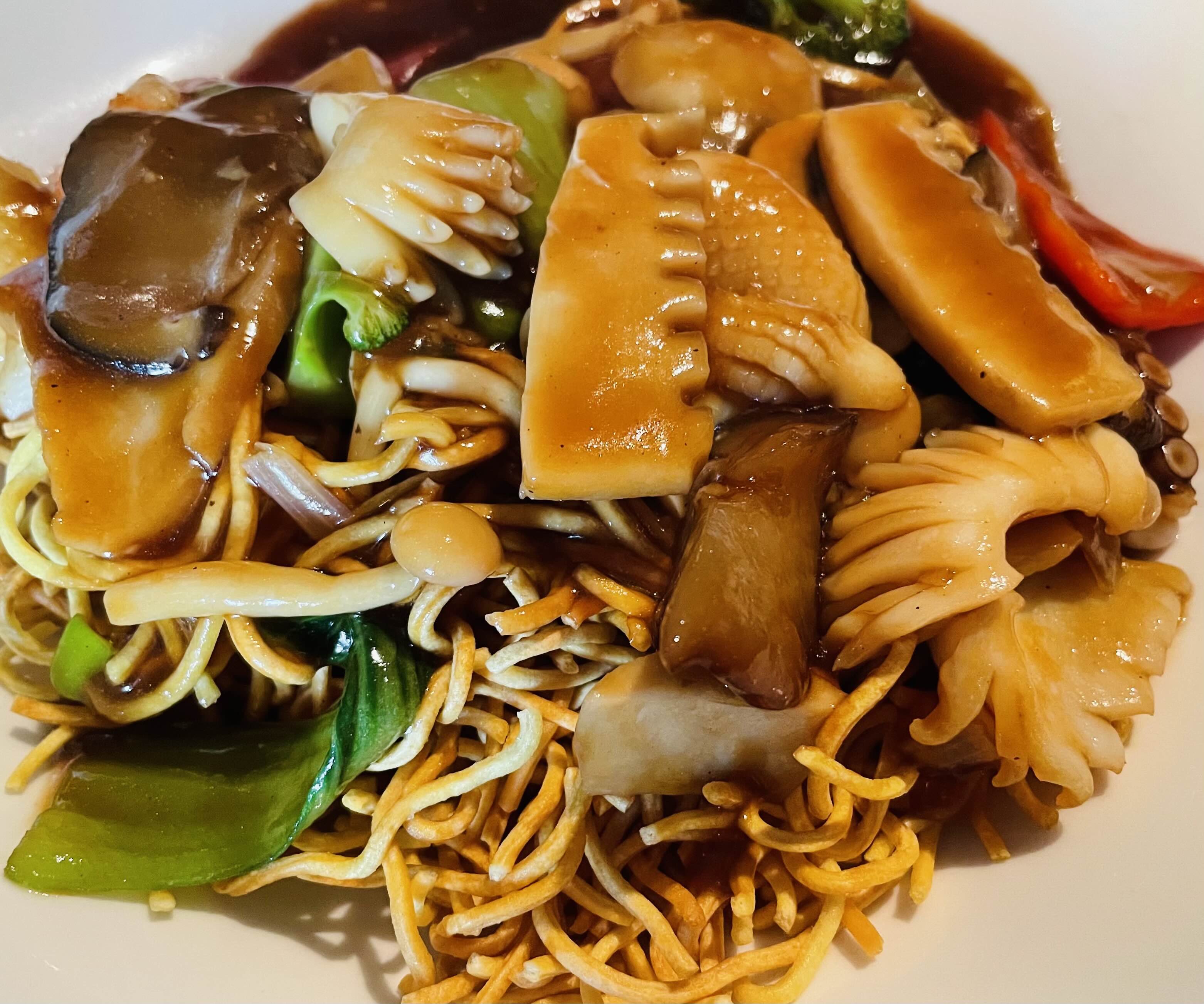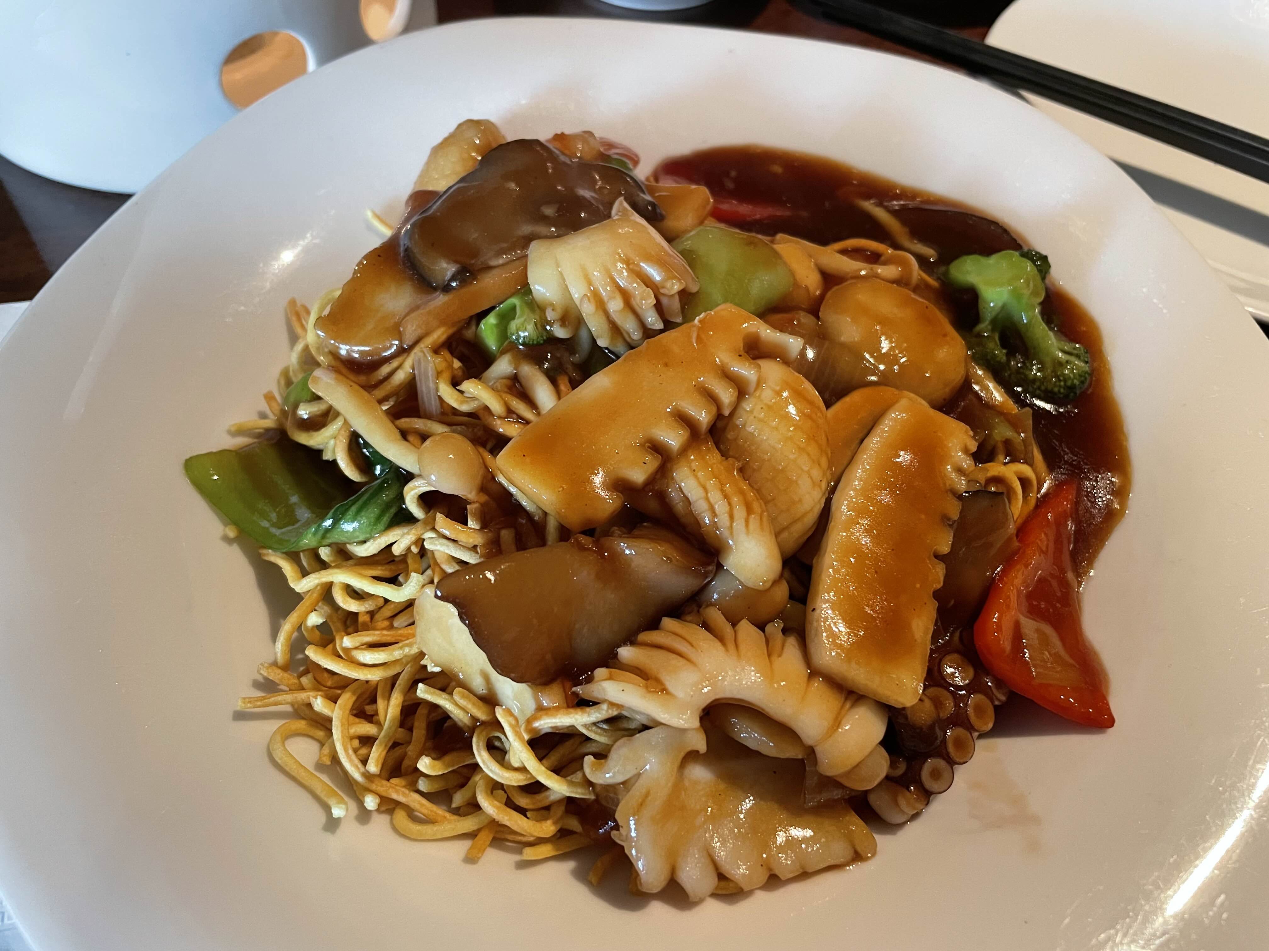짬뽕이나 볶음밥 같은 일반적인 중국집 메뉴도 있지만, 기왕이면 다른 곳에선 흔치 않은 메뉴를 먹어보고 싶어 팔진초면을 골랐다. 얇은 튀긴 면 위에 해산물, 야채와 같이 볶은 소스가 얹어 나오는데, 소스가 묻지 않은 면은 바삭하고, 소스에 적시면 바로 먹기 좋게 녹진해진다. 해산물들이 실하고, 면의 식감도 독특하고 소스도 맛있다.