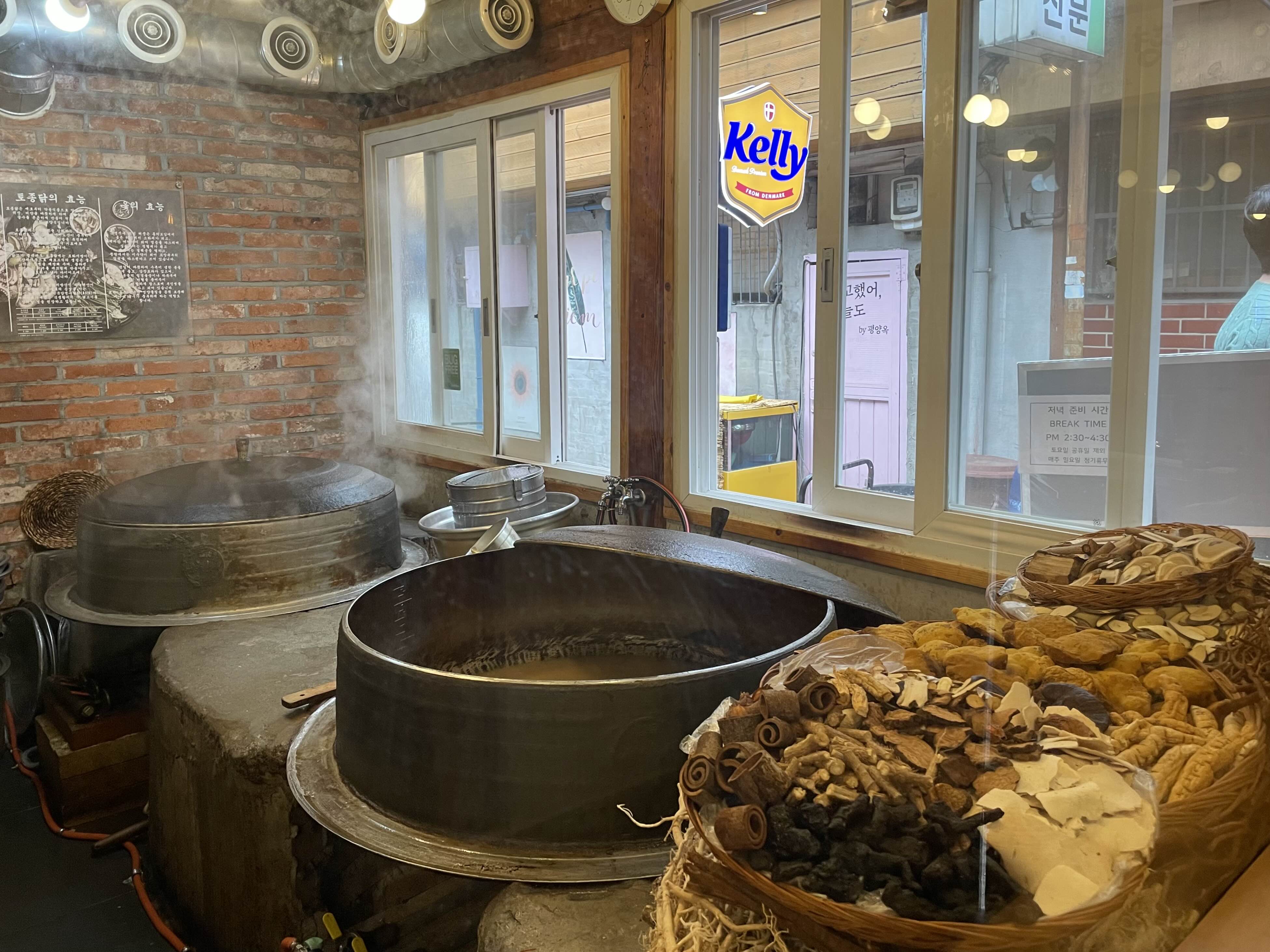 가게 입구의 커다란 가마솥과 각종 약재