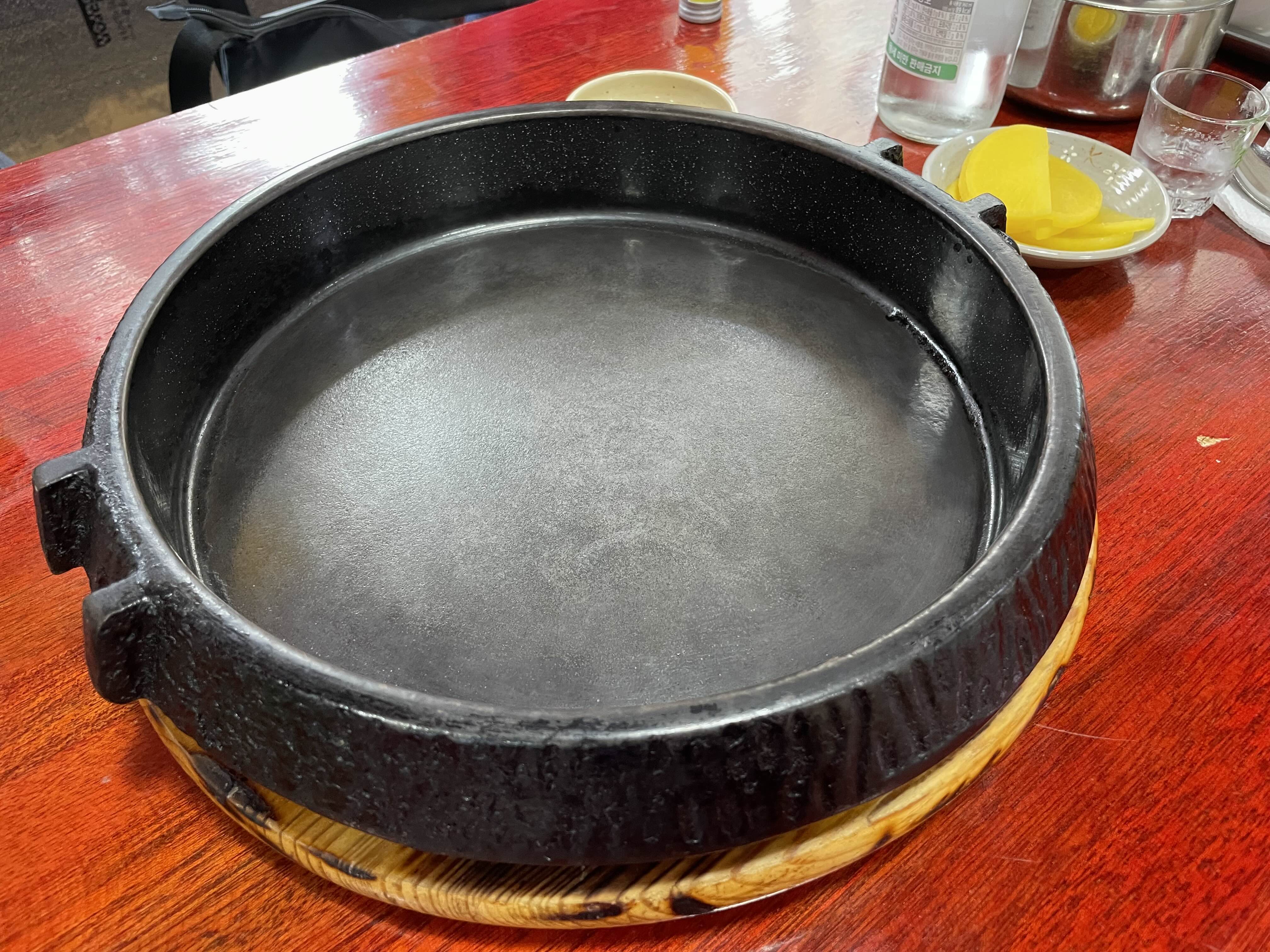 해물누룽지탕을 주문하면 먼저 달궈진 커다란 무쇠팬이 등장하고