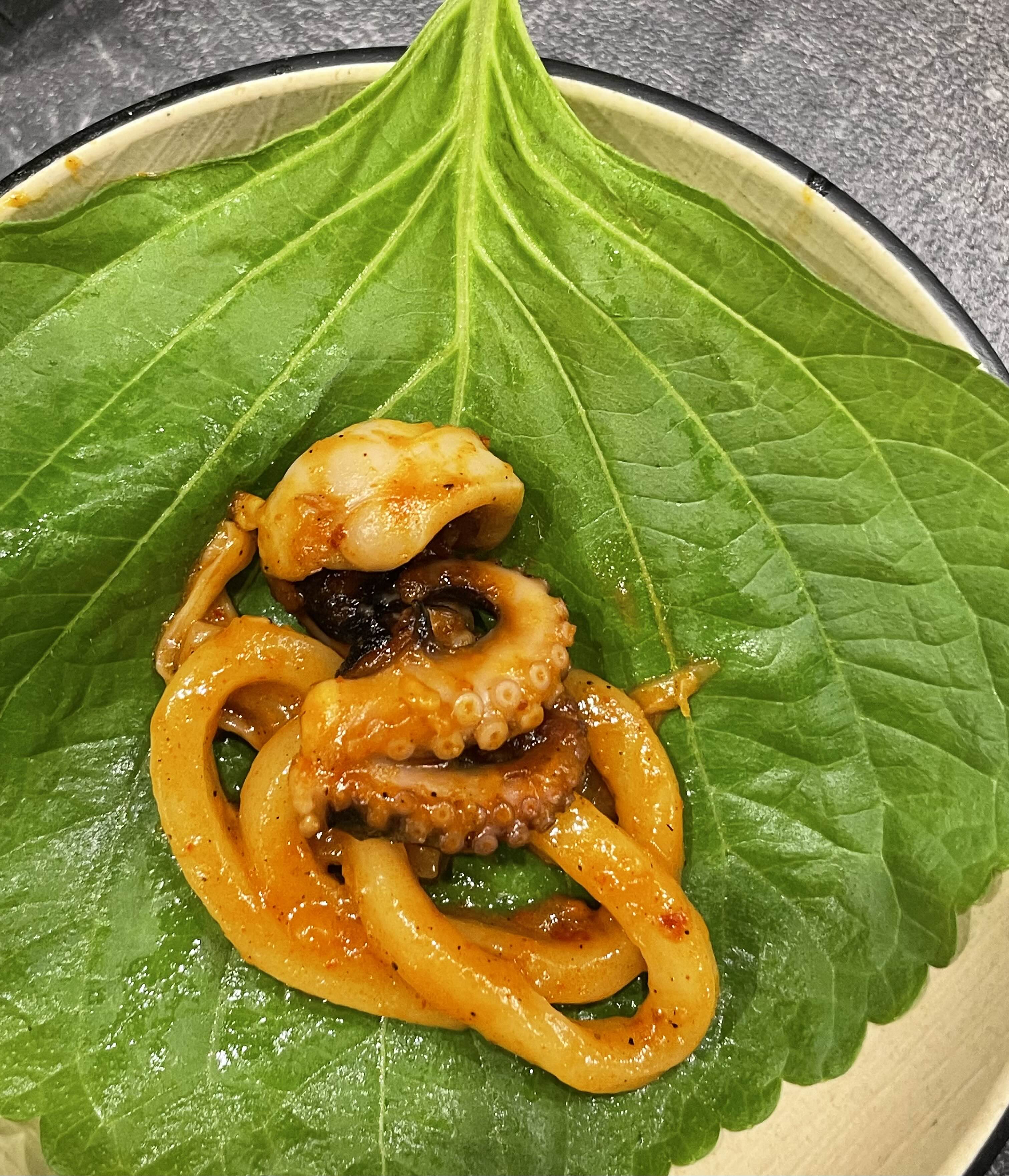 사장님이 반찬 리필해주러 오셨다가 아앗? 하시더니 가저다주신 깻잎. 깻잎과 쭈꾸미와 우동면의 조화.. 좋았구여..