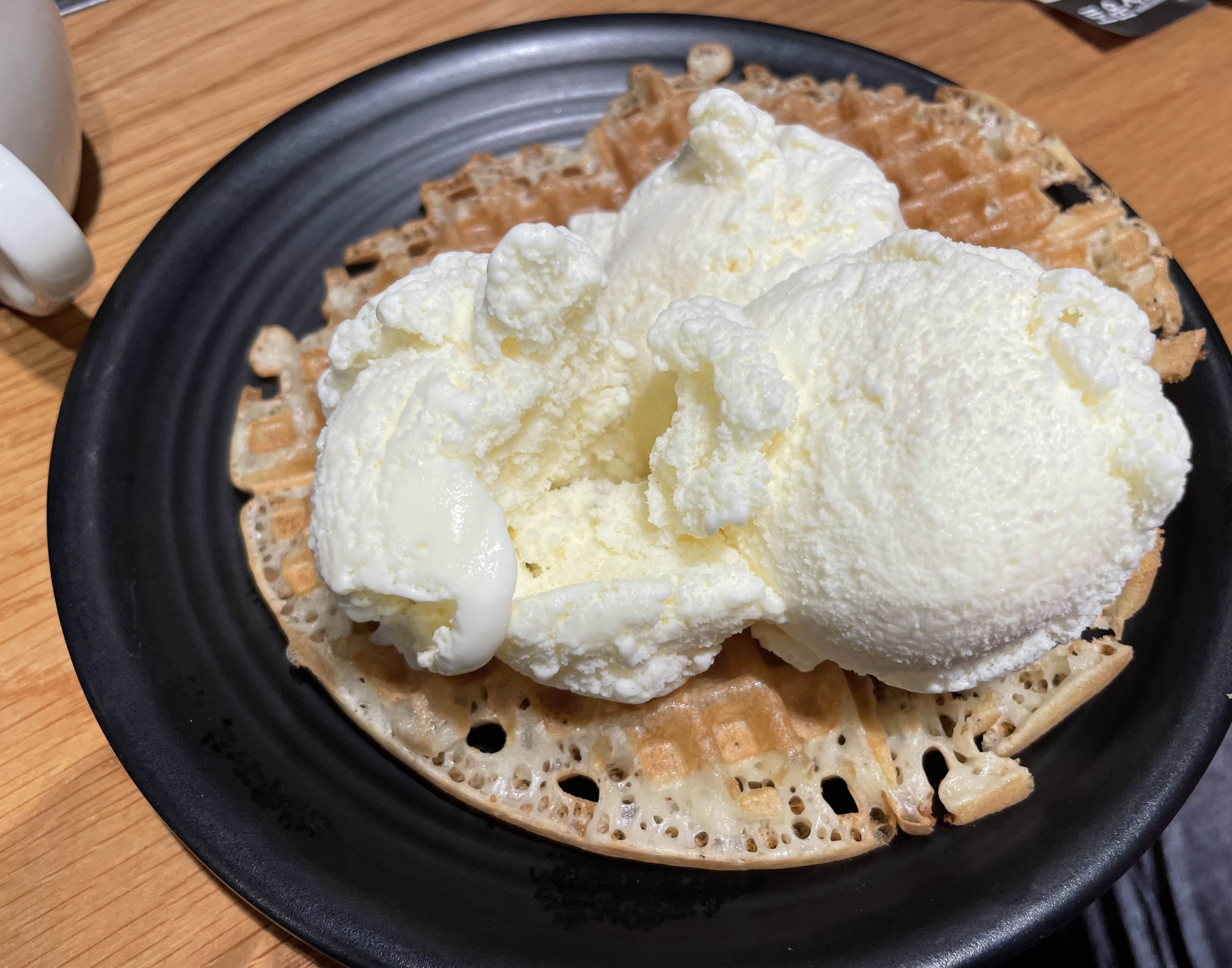 배가 불렀지만 즉석 와플기계, 즉석 크레이프 기계 같은 걸 보면 괜히 지나치기가 아쉽다. 그래서 못참고 한판 구워온 와플과 바닐라 아이스크림. 와플기계는 모두에게 인기 코너라 내가 갔을땐 반죽이 부족해서, 어쩔 수 없이 모자라게 부었는데, 그래서 오히려 더 바삭하니 맛있었다 :D 차갑고 부드러운 아이스크림을 올려먹으니 대존맛.