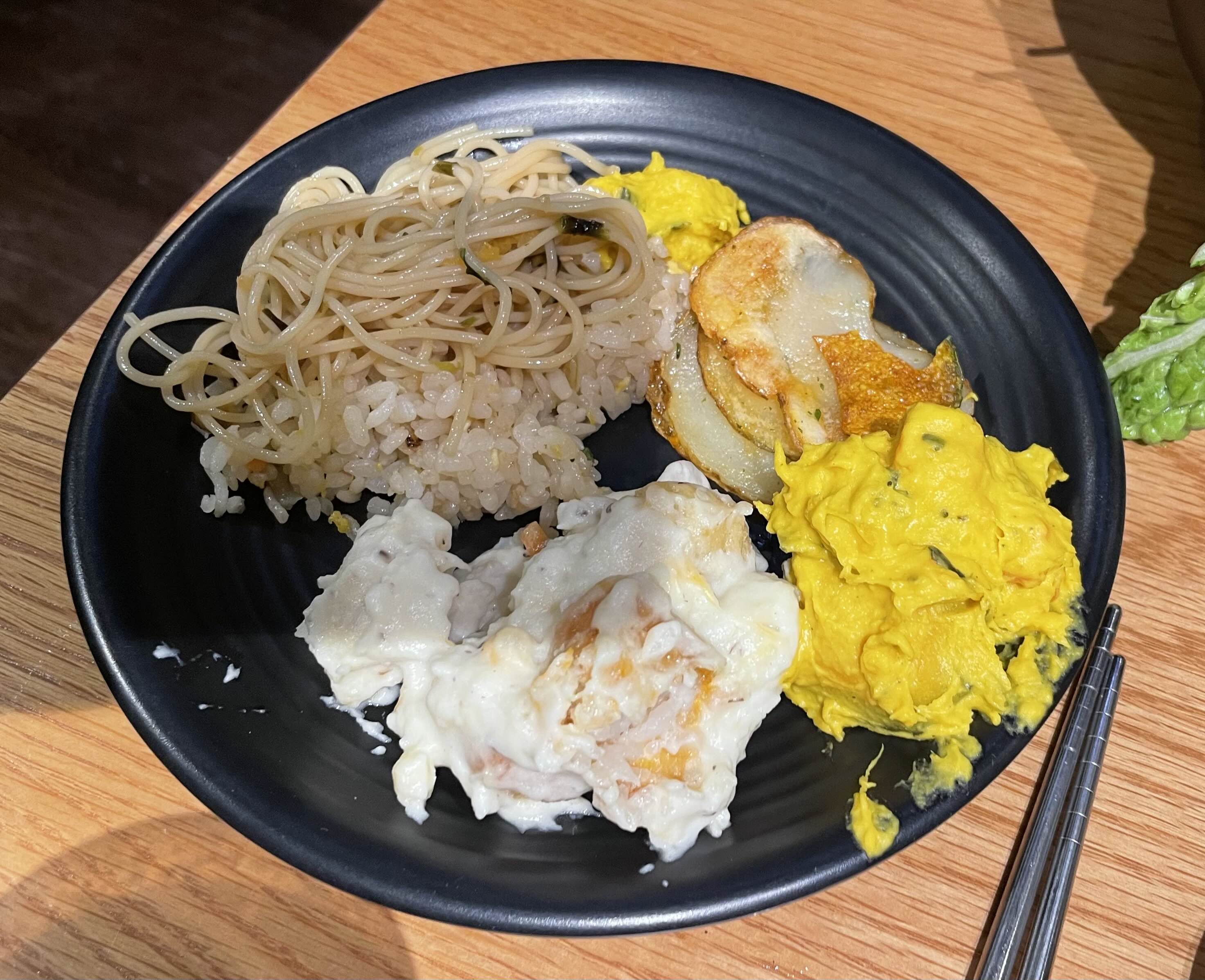 묵은지 파스타, 볶음밥, 허니버터감자칩, 단호박샐러드, 그리고 뇨끼