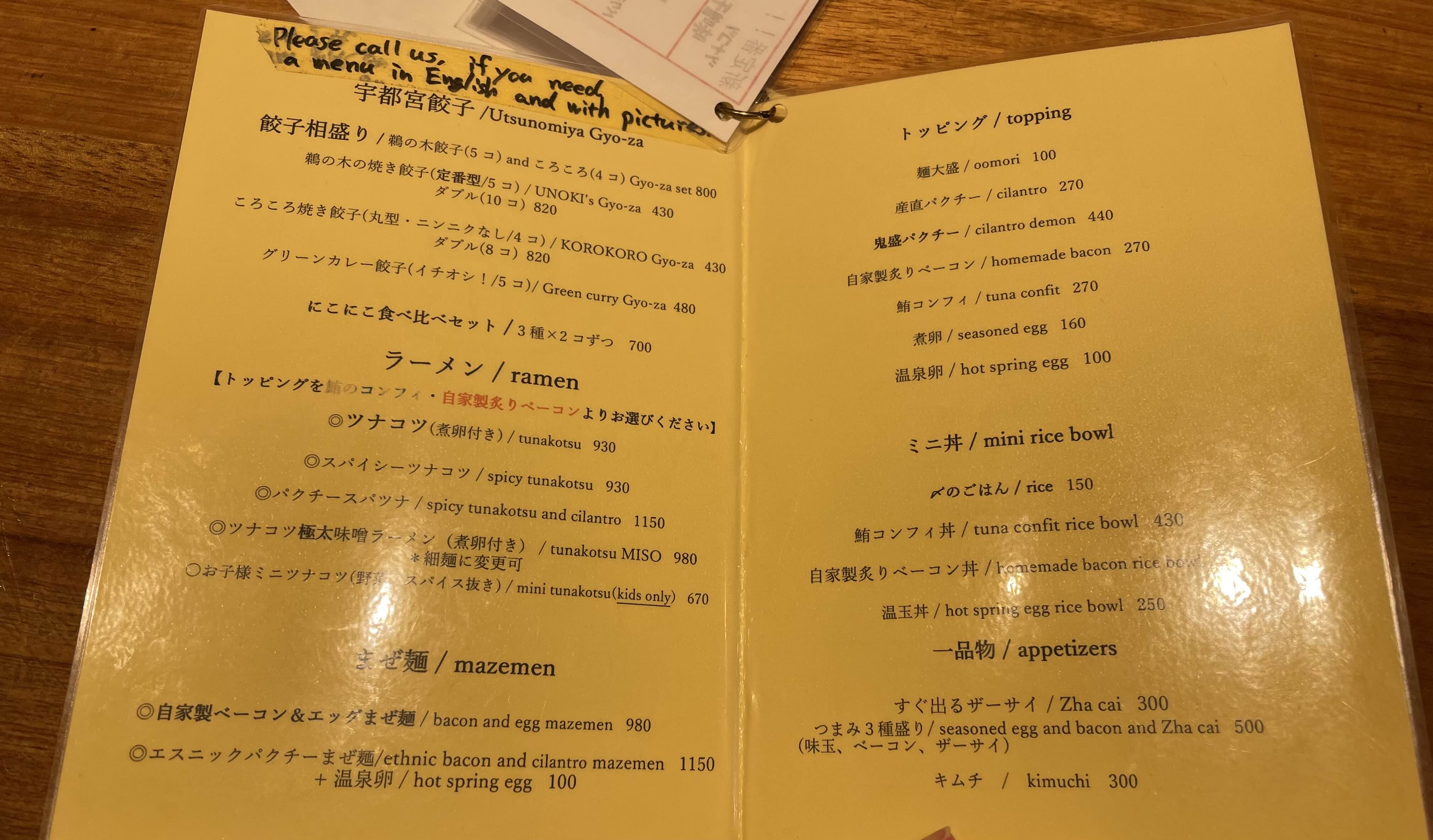꽤 오래 메뉴판을 들여보다가 참치라멘에 참치토핑을 선택하고, 우츠노미야 교자도 같이 주문했다 :)