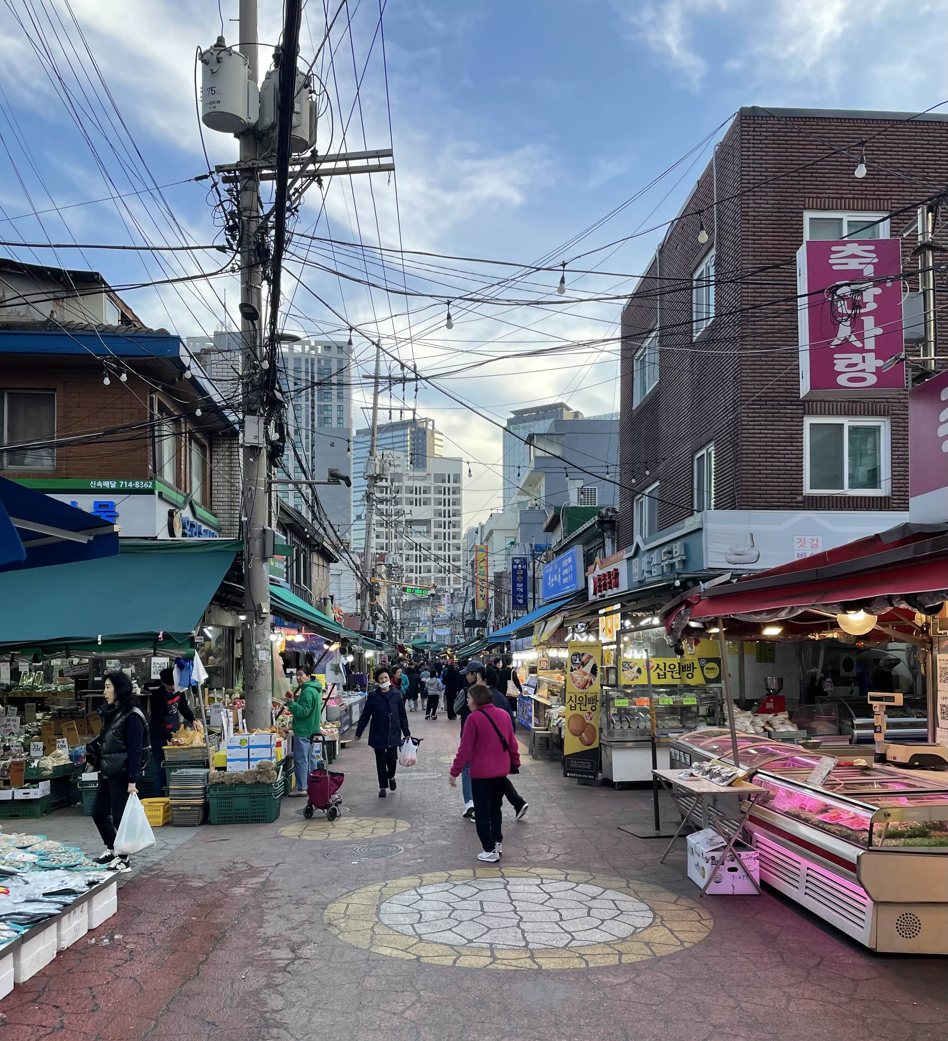 생선 과일 야채 정육 족말 치킨 떡 반찬 횟집 빵집 등등 다양한 가게가 있었다.