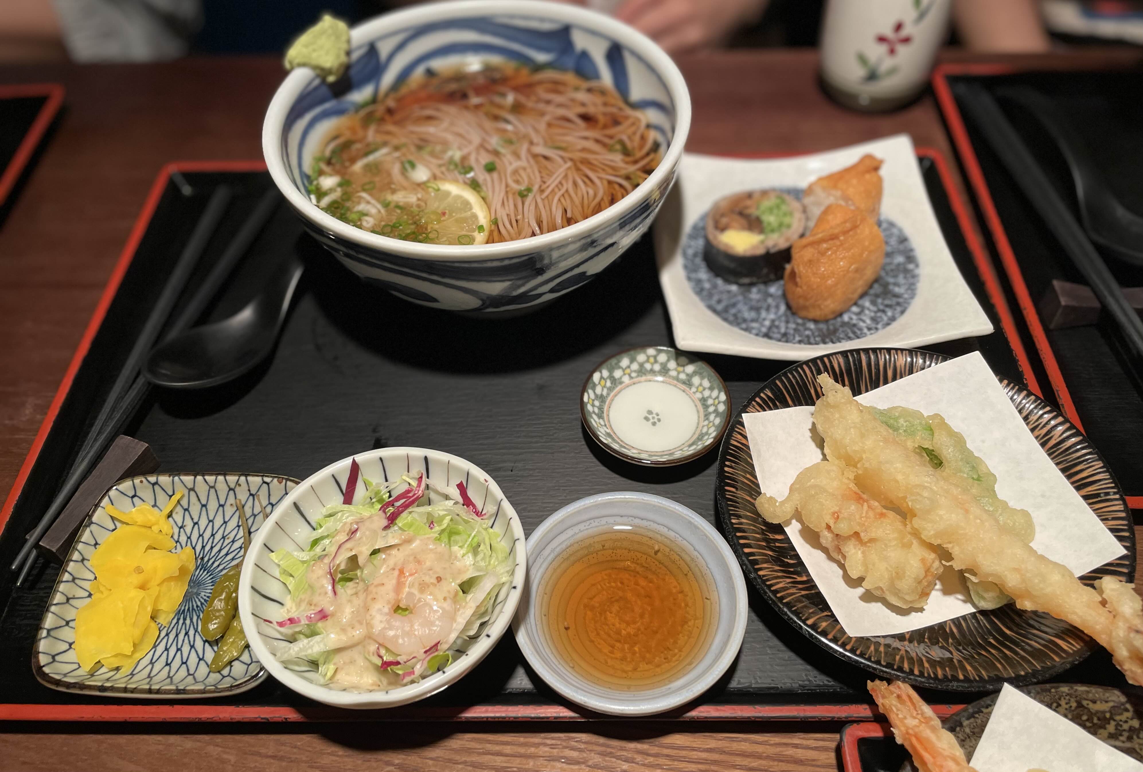 평일 런치 냉소면 정식은 냉소면 + 유부초밥2 + 소바마끼1 + 튀김 + 샐러드로 구성되어 있었는데