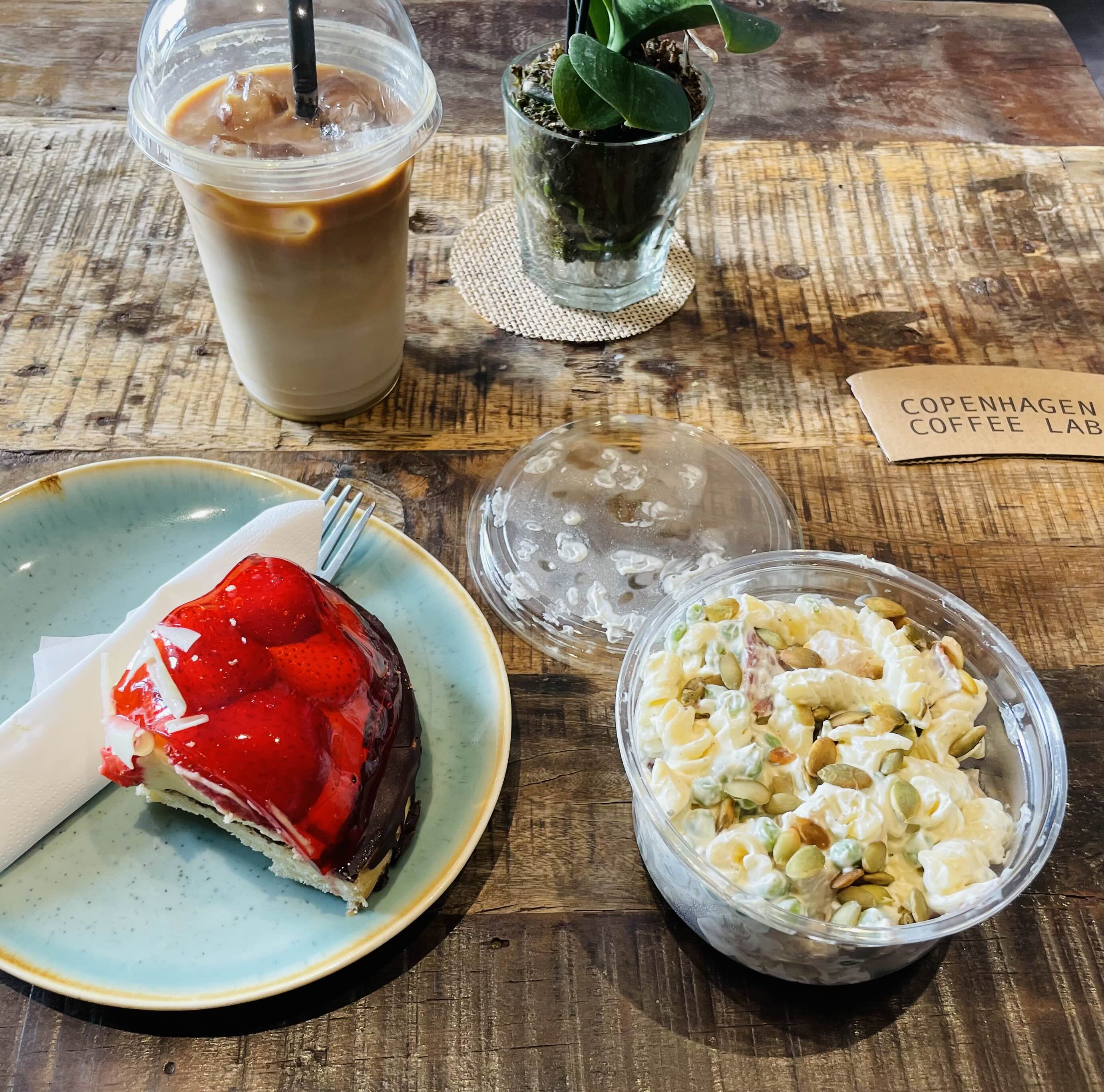 진열대에서 식사가 될만한 건 Pasta Salad 하나라 일단 그걸 고르고(59크로네) 하나만으로는 아쉬워 딸기케이크Jordbørkage도 고르고 (50크로네) 커피는 Simple Ice Coffee (48크로네) 를 주문했다.
