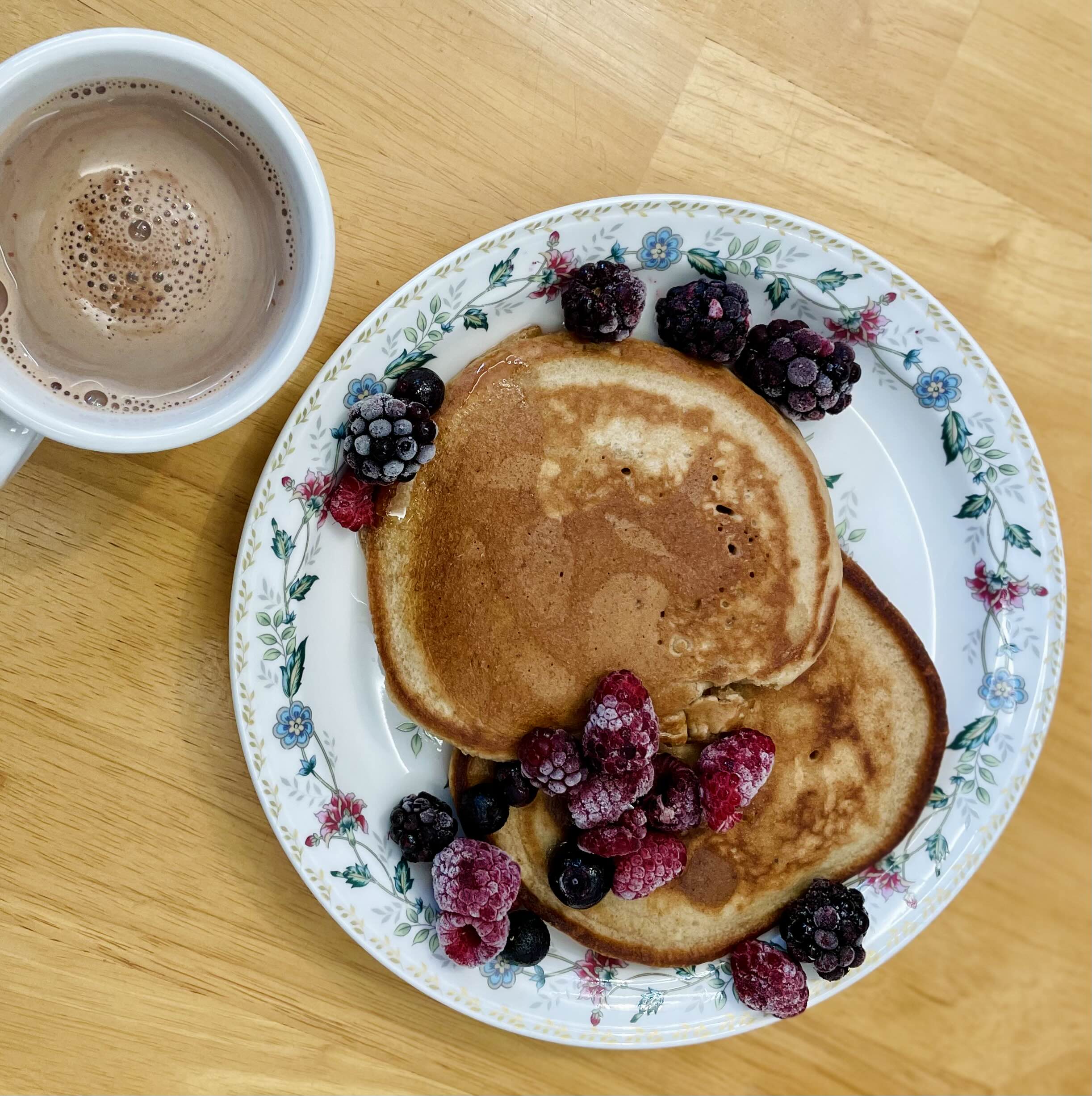 팬케이크 가루에 코코아가루를 넣어서 팬케이크를 구워 먹었다. 시럽 대신 알룰로스를 뿌리고 냉동 트리플베리는 대충 봉지째로 부은, 데코는 1도 없는 자연인의 밥상이다ㅎㅎ 그래도 맛있다.