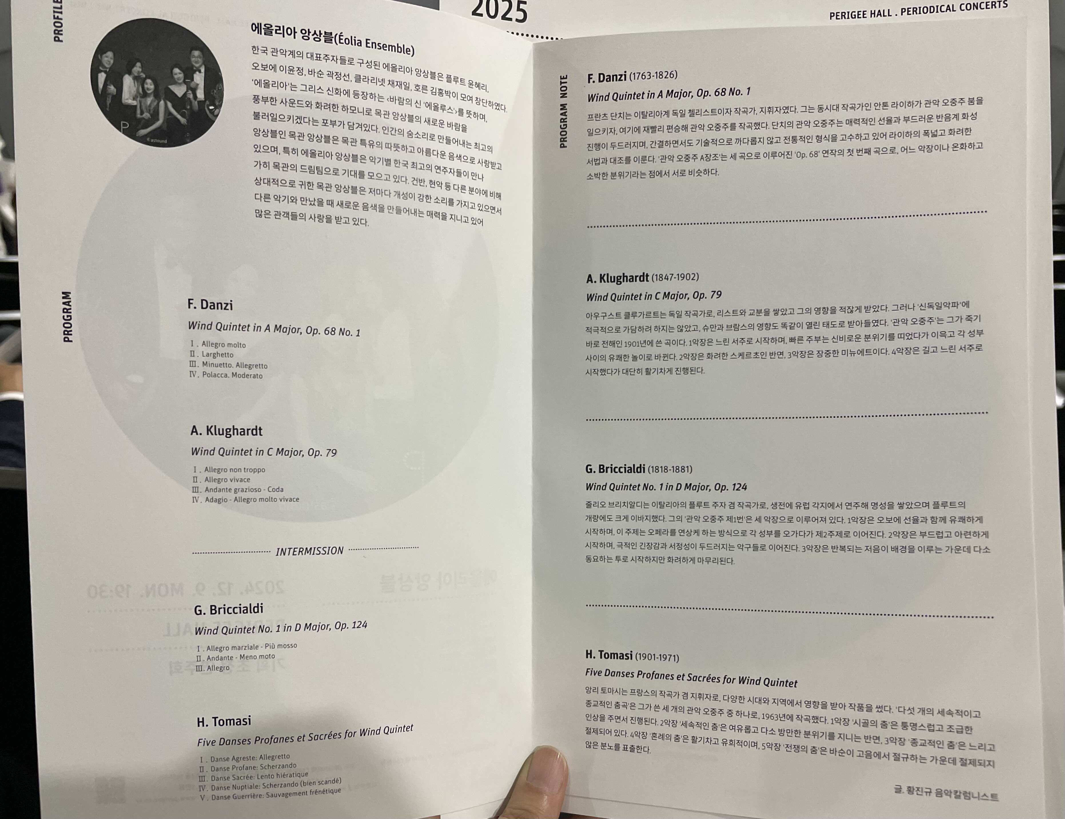 - 브리치알디는 플루트 연주가, 제작가, 작곡가이면서 교수였으며 마치 플루트 계의 파가니니같은 존재였다고 한다ㅎㅎ 작품 해설지에도 "오페라를 연상케 하는 방식으로"라고 기재되어 있듯이 목관 오중주만으로 이런 연주가 가능하다고?싶을 정도로 풍성하고 흥미진진한 곡이었다.