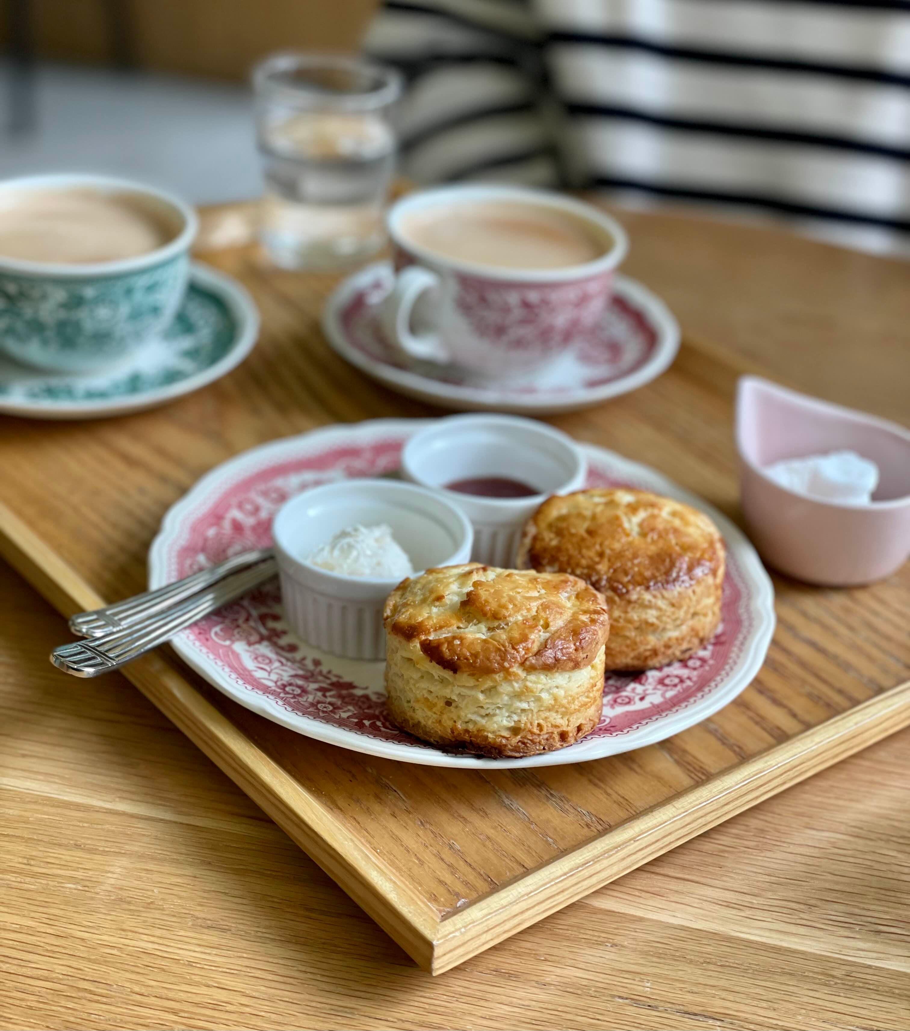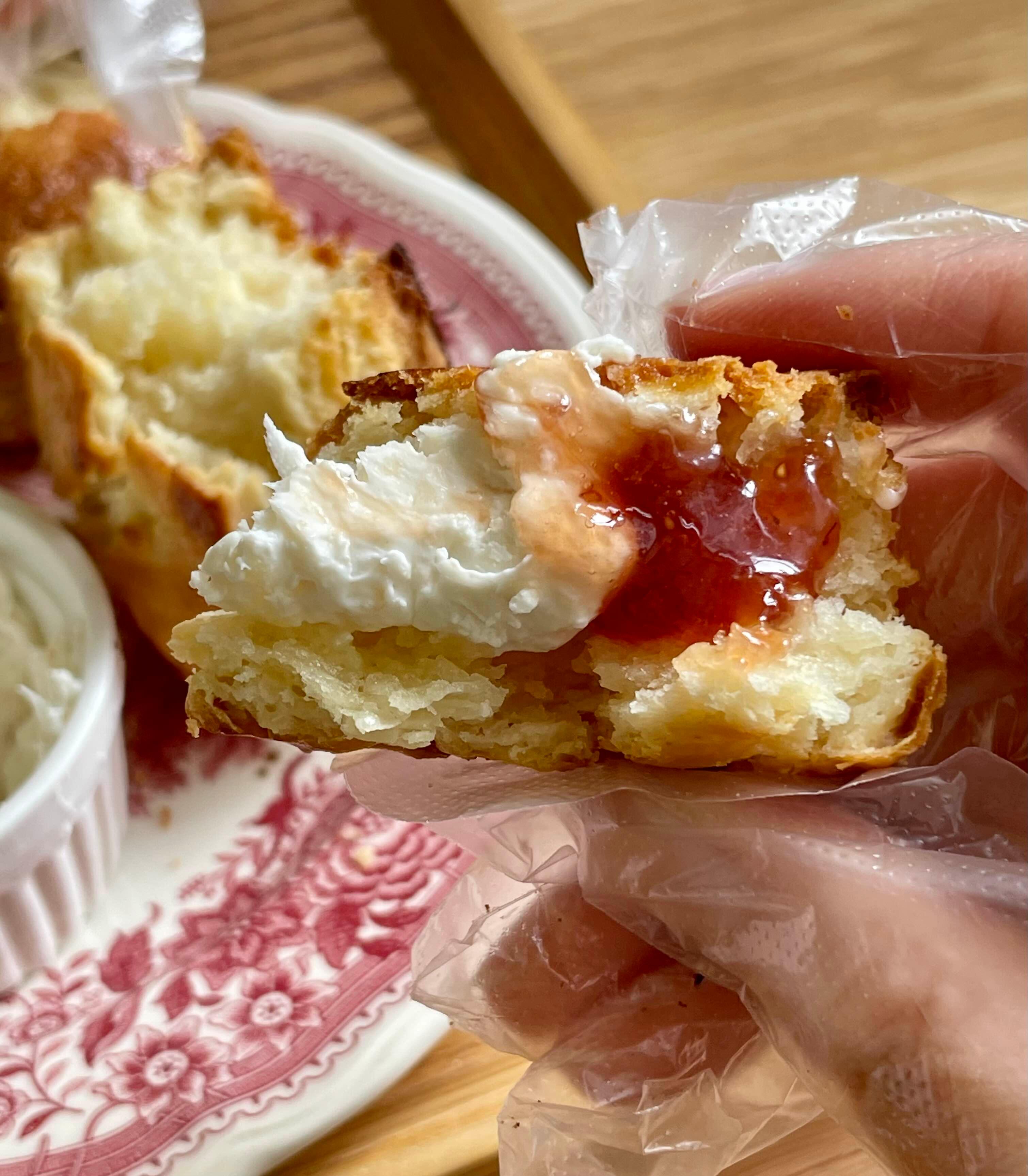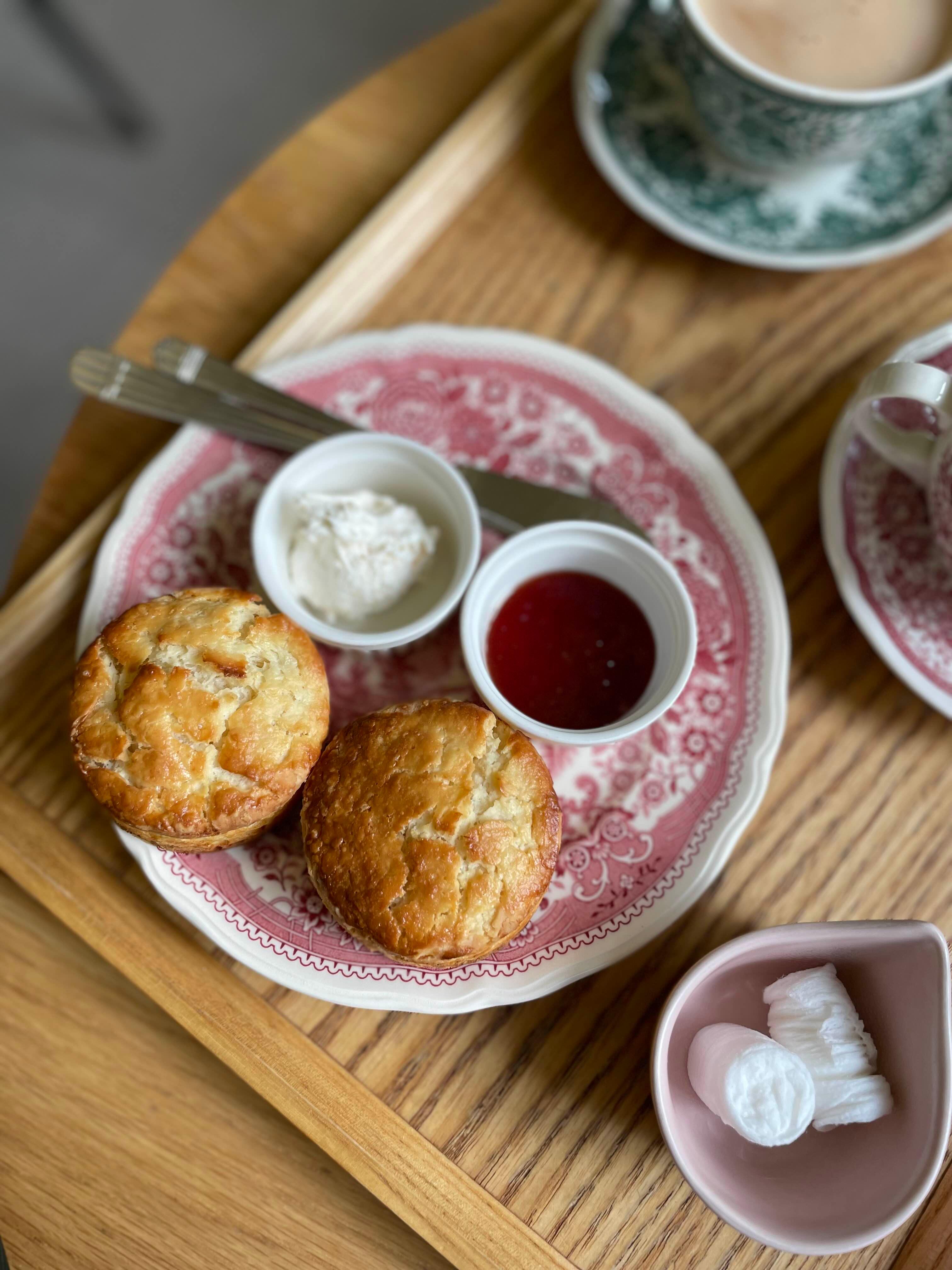 스콘에 산뜻한 풍미의 클로티드크림과 딸기잼 발라먹기!