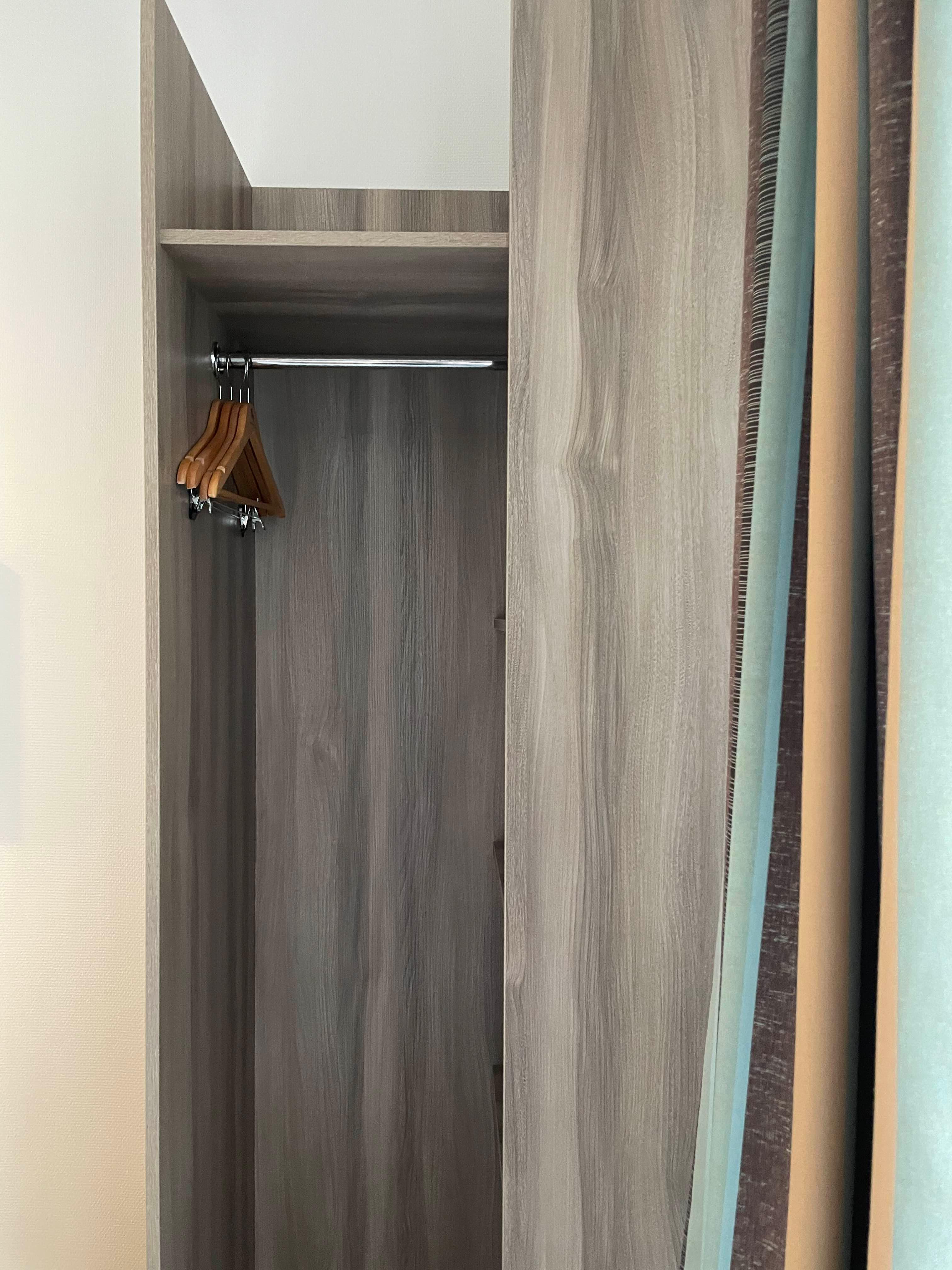 옷걸이와 안쪽으로 선반이 있는 옷장이 하나 있었고