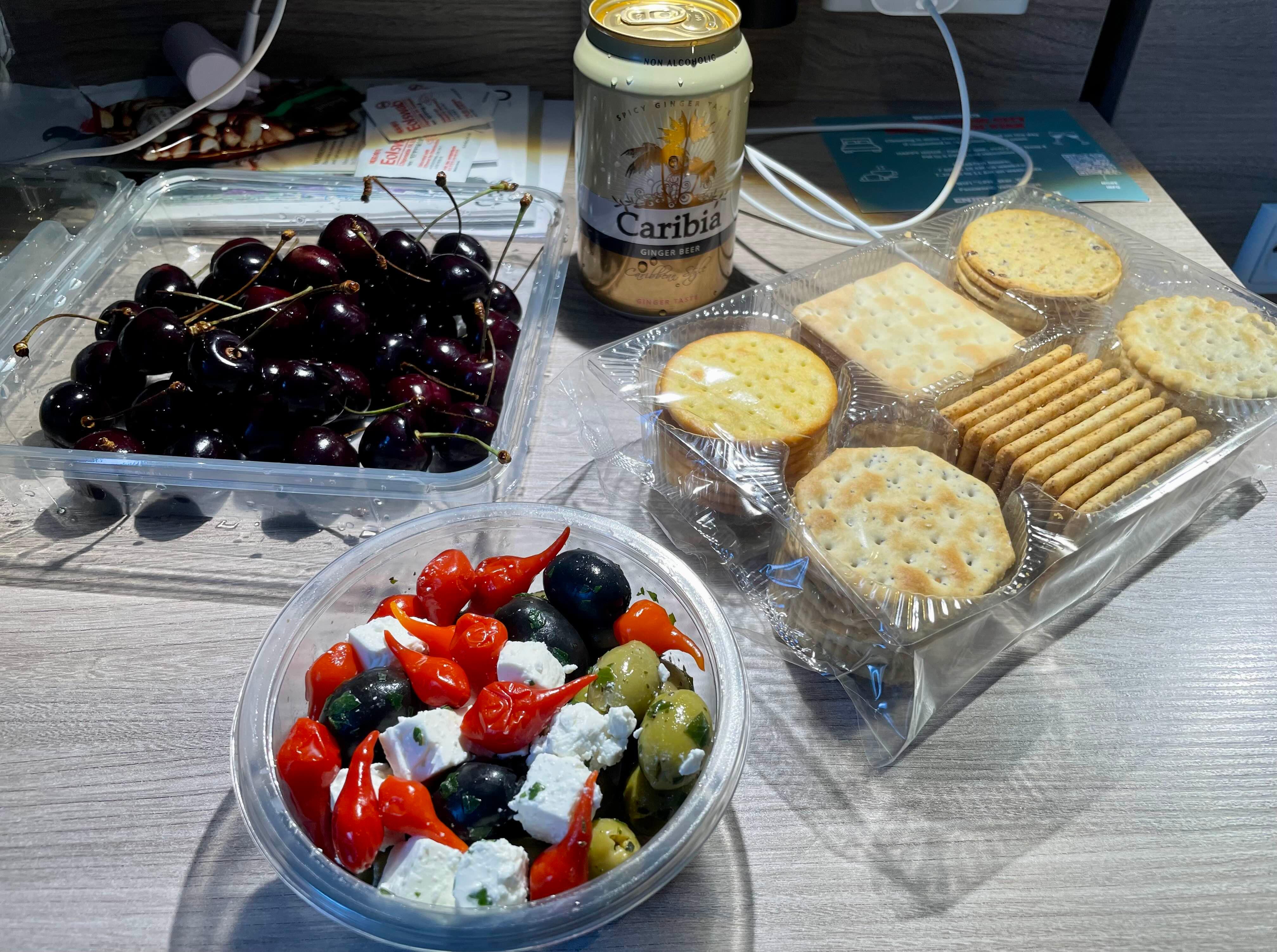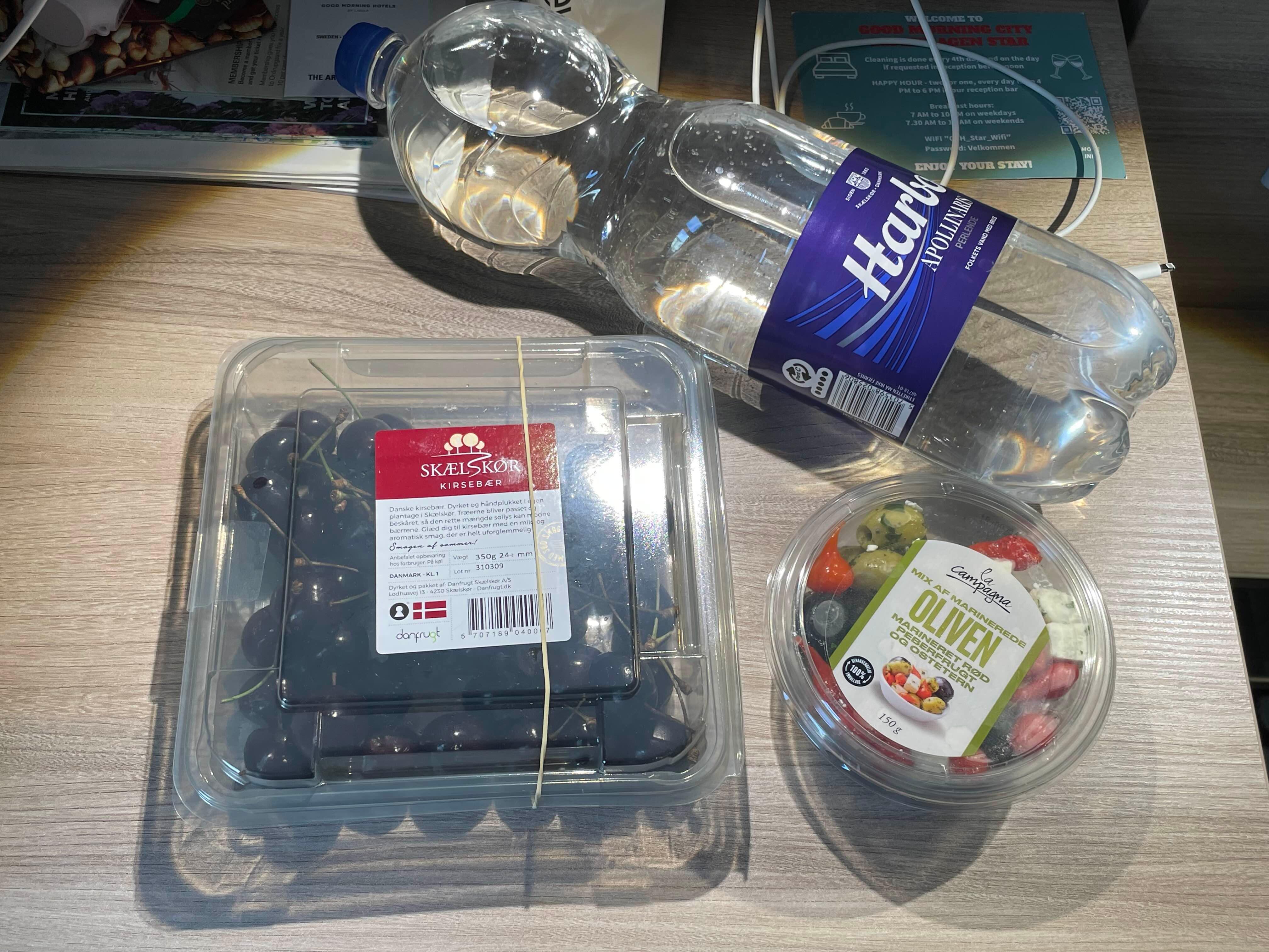 Netto에서 산 것은 결국 체리와 올리브 믹스, 생수 한 병이 전부였다.
