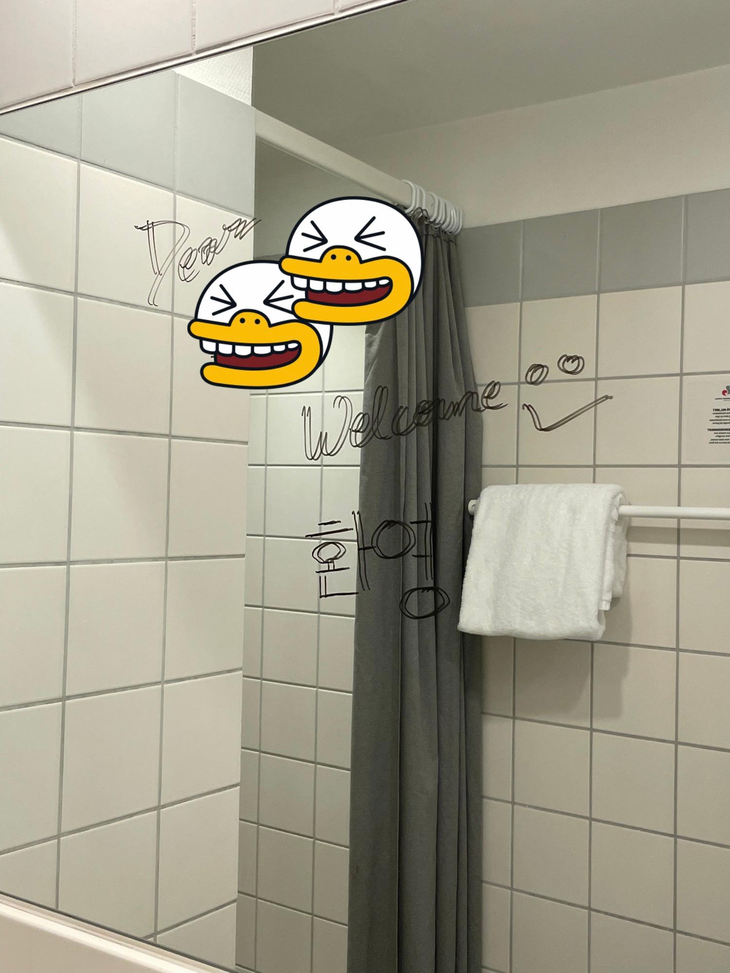 그리고 욕실 거울에도 환영 메세지가 젹혀 있었다!
