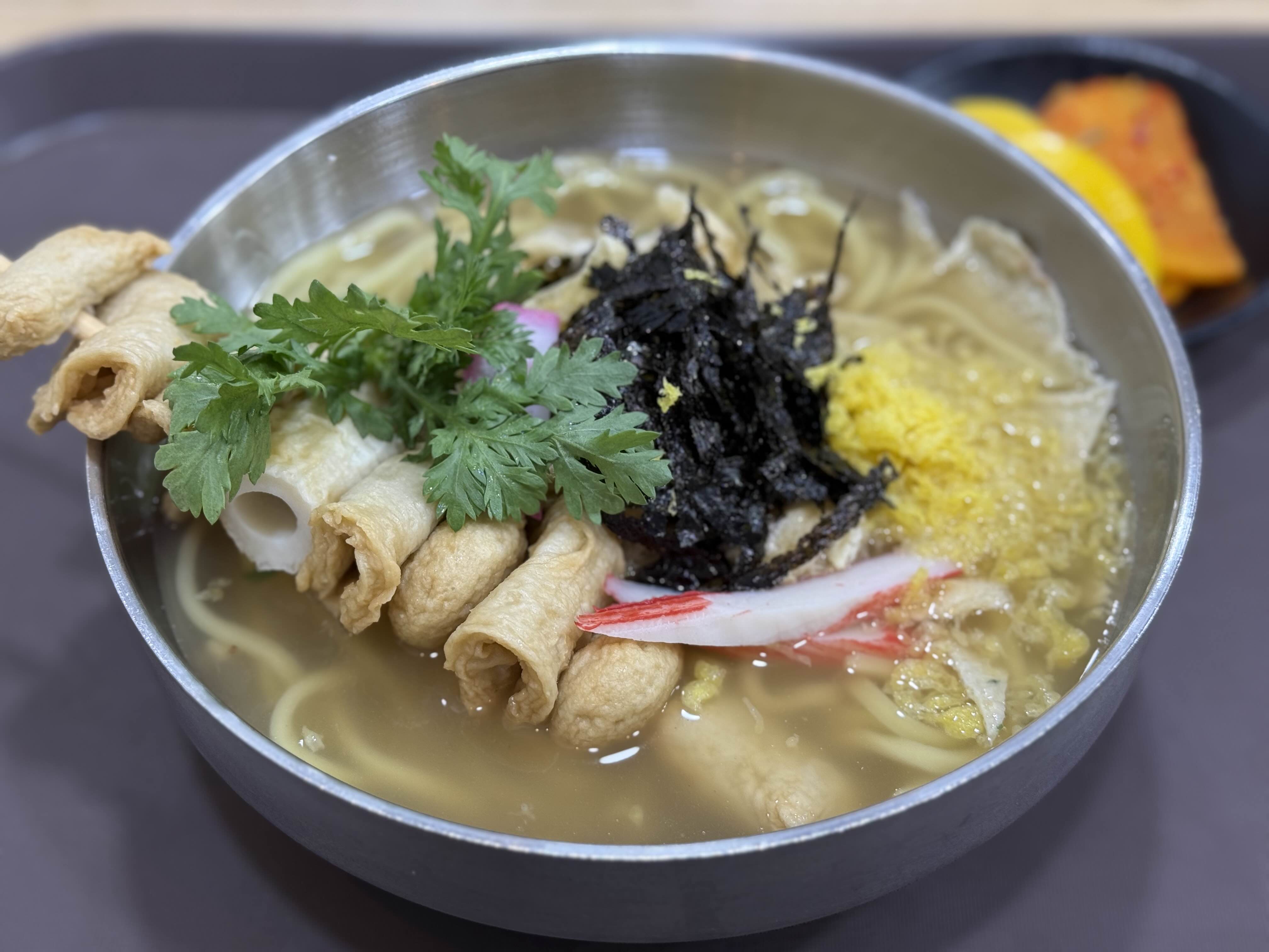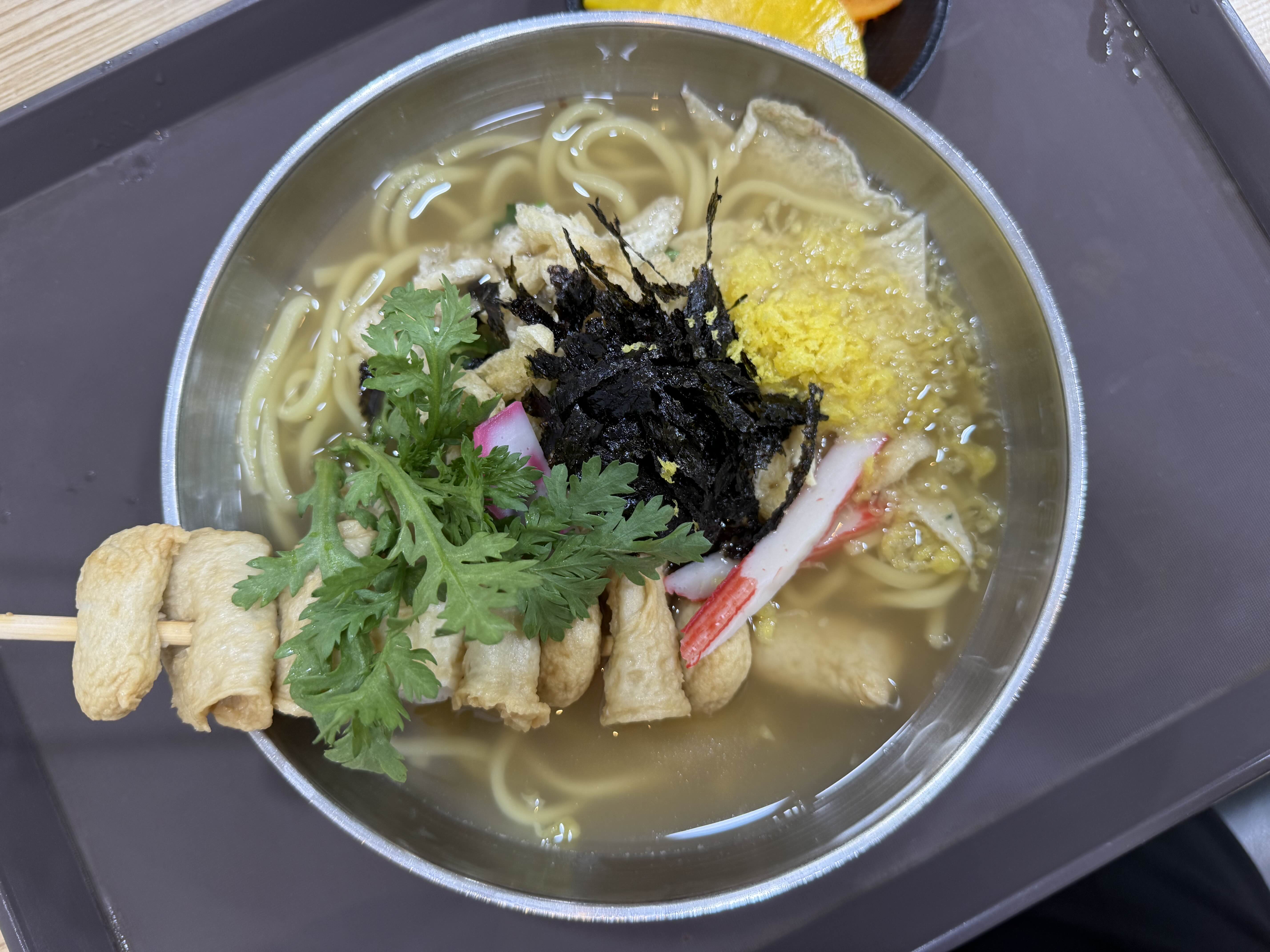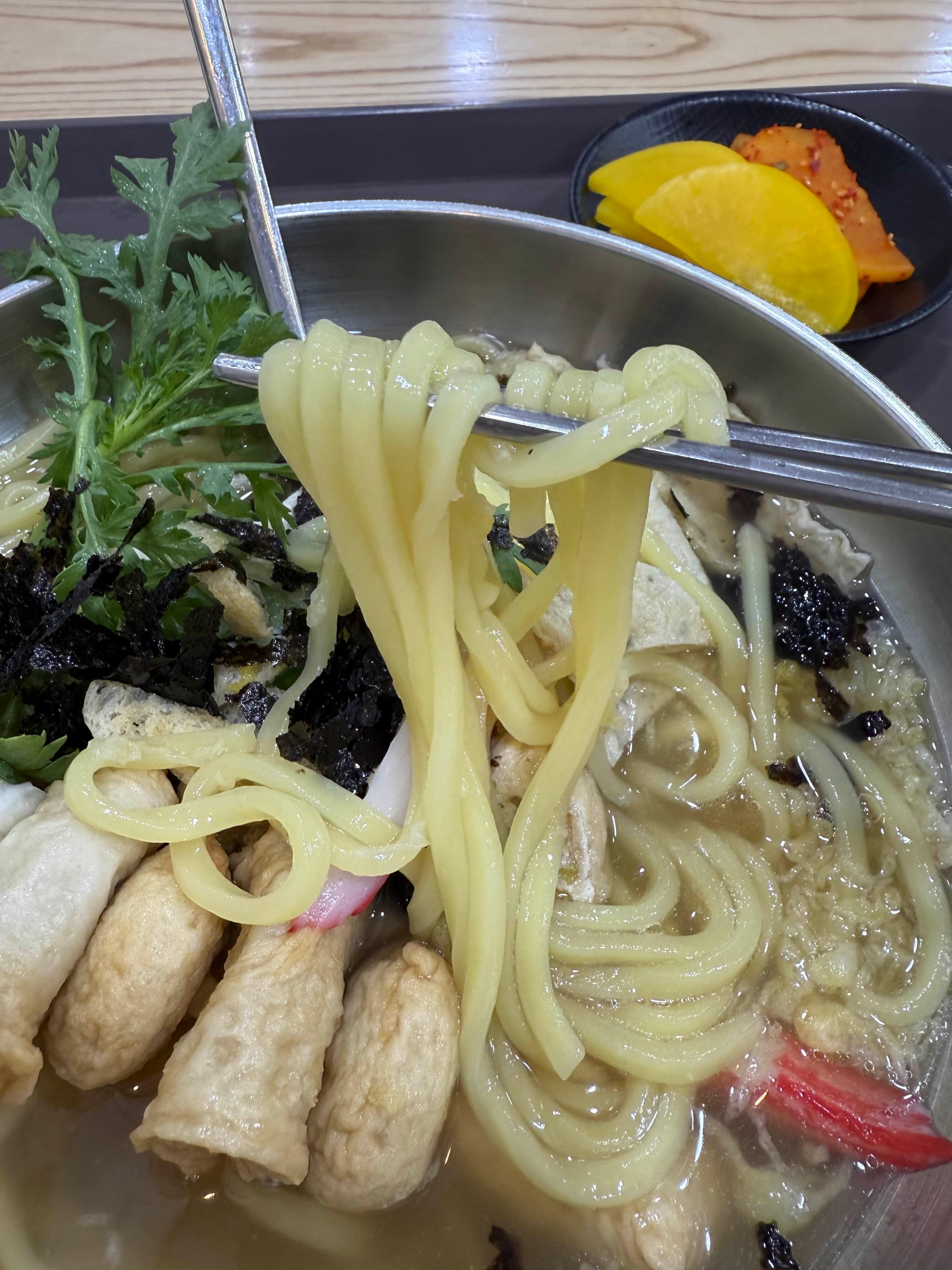 쑥갓과 꼬치어묵, 튀김가루, 맛살, 김가루 등등의 다양한 고명이 골고루 들어가 있고, 노란색의 우동면발은 부드러우면서도 쫄깃하다. 만족스럽게 우동을 먹었다 :)