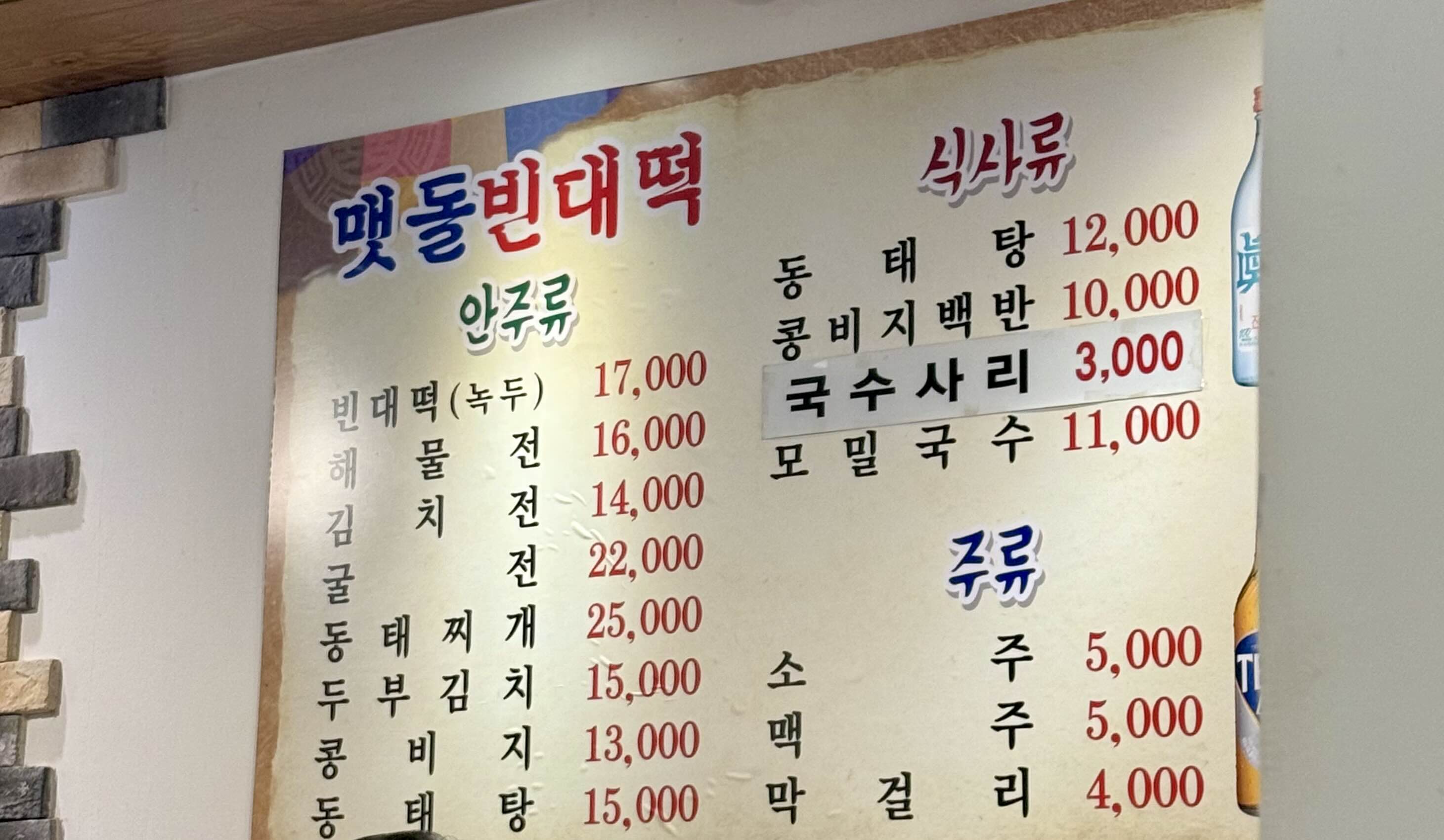 세 명이 가서 전 두 개 먹었는데 배가 너무 불러서 아쉽게도 다른 메뉴는 더 시키지 못함. 가격도 착하고 맛도 좋고 만족스러운 식사였다.