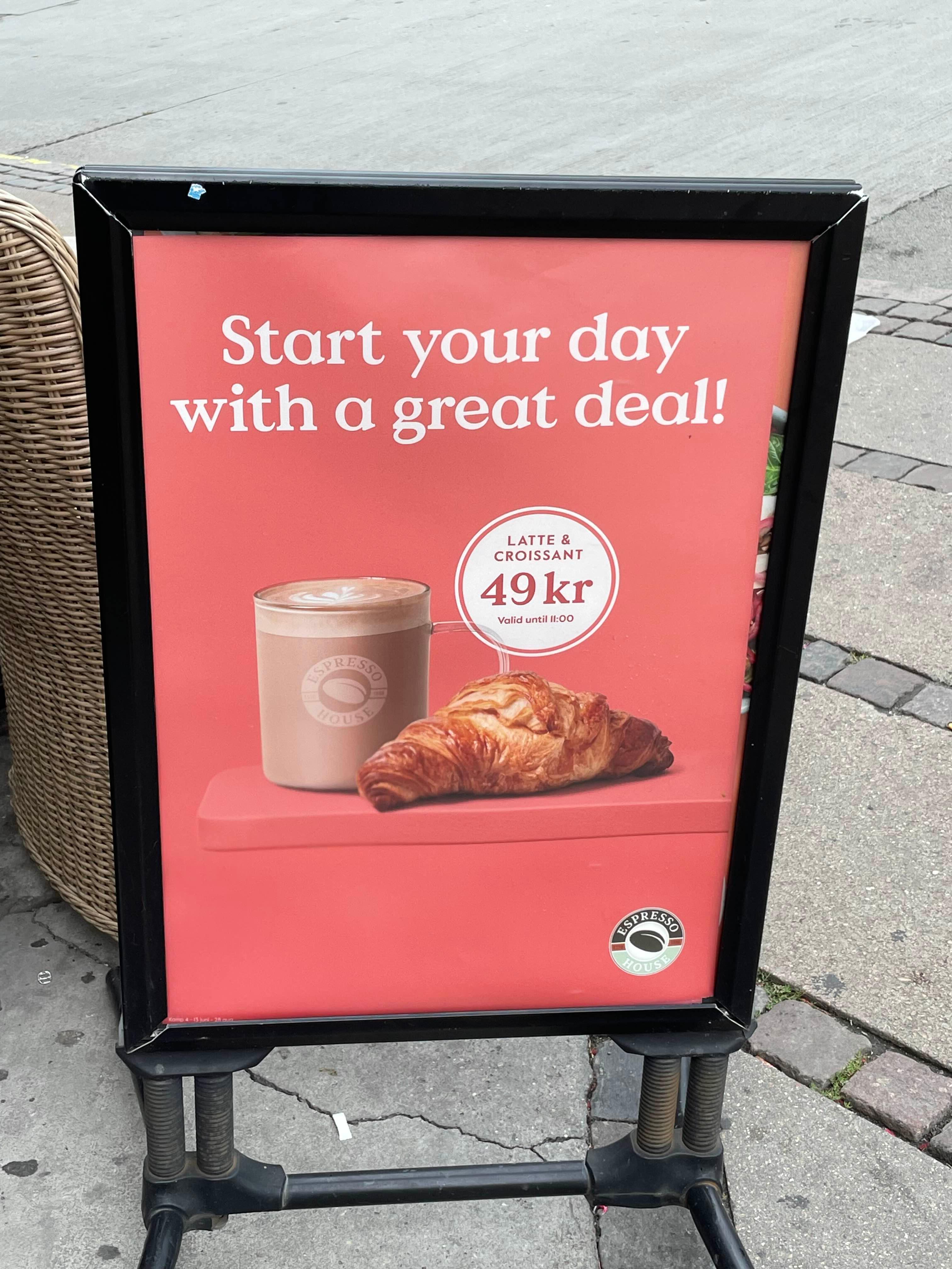 오전 11시까지는 라뗴 & 크루아상이 49크로네! (원래는 라뗴 단품 가격이 49크로네다) 당시 환율로는 대략 만원 정도.